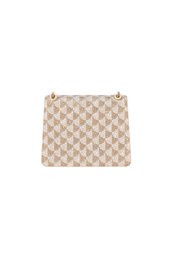 A modern evolution of a timeless model, the Serpenti Forever Day-to-Night small shoulder bag displays a contemporary metamorphosis of its versatile and iconic design, elevated by magnificent workmanship. Skilfully crafted in suede, the bag is covered with hand-applied topaz and platinum Calla Crystals that form a sparkling leitmotif drawing from the fan-shaped polychrome mosaics of the Baths of Caracalla, a source of inspiration for the Divas' Dream jewellery line. Equipped with a sliding snake body-shaped chain strap, the creation is topped by the iconic snakehead magnetic closure, whose mesmerising design and scales, inspired by the Serpenti jewels of the '60s, display a diamond-cut effect, namely a grainy metallic texture that shimmers like a snow-set pavé. Featuring a single compartment, the model is completed by an internal flat pocket and a mirror pocket with customisable mirror. 19 x 14 x 4 cm - 7.5 x 5.5 x 1.6 inches. Made in Italy.