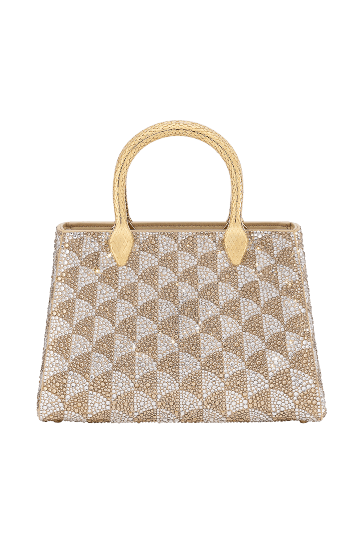 Serpentine Duo tote bag in a topaz and platinum Calla Crystals pattern on suede with a bright Travertino nappa leather lining. Captivating double-head snake body-shaped handles in gold-plated brass embellished with engraved scales.