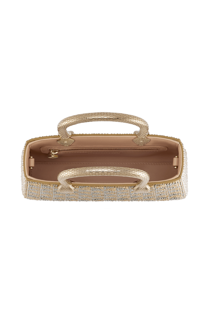 Exuding a sophisticated appeal, the Serpentine Duo tote bag combines jewellery-inspired details, evoking the serpent's sinuous movements, with exceptional craftsmanship and Roman inspiration. Masterfully crafted in suede, the bag is covered with hand-applied topaz and platinum Calla Crystals that form a sparkling leitmotif drawing from the fan-shaped polychrome mosaics of the Baths of Caracalla, a source of inspiration for the Divas' Dream jewellery line. Featuring two snake body-shaped handles embellished with engraved scales, whose design draws inspiration from a bold 1960s Serpenti Bvlgari watch, the model is completed by a leather strap, a single open compartment, an internal flat pocket and a zipped pocket. 21.5 x 15 x 4 cm - 8.5 x 5.9 x 1.6 inches. Made in Italy.