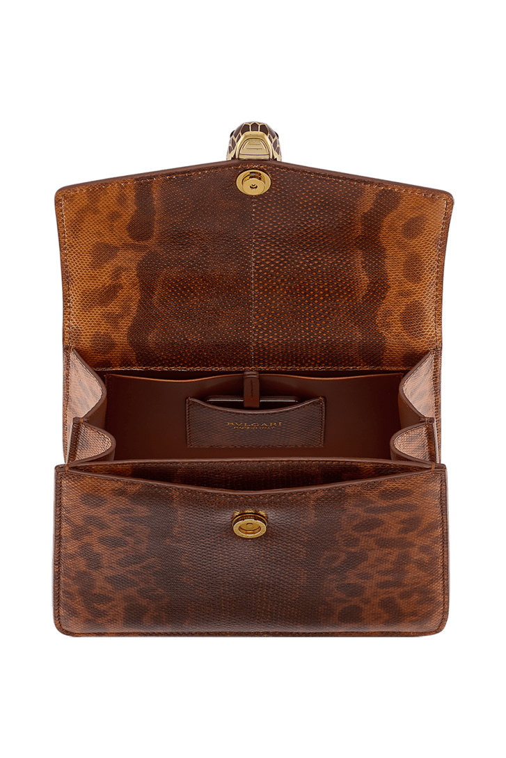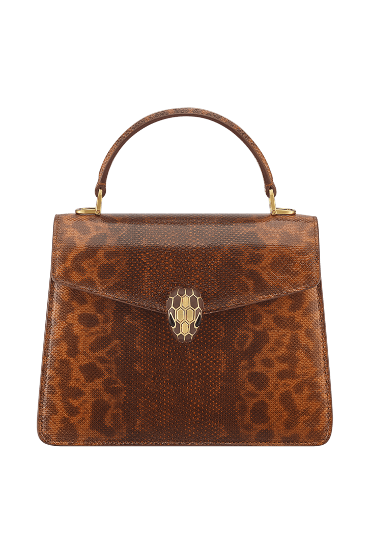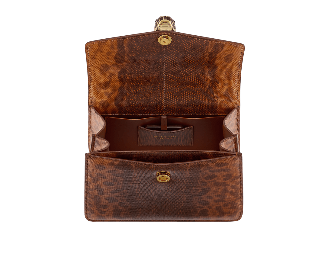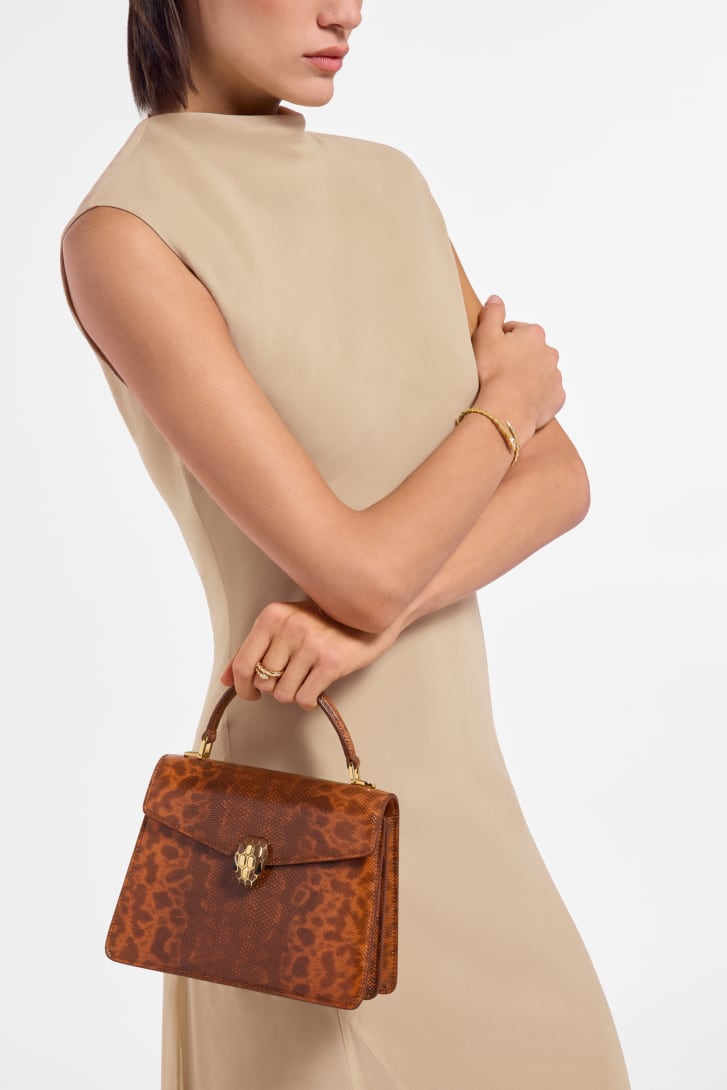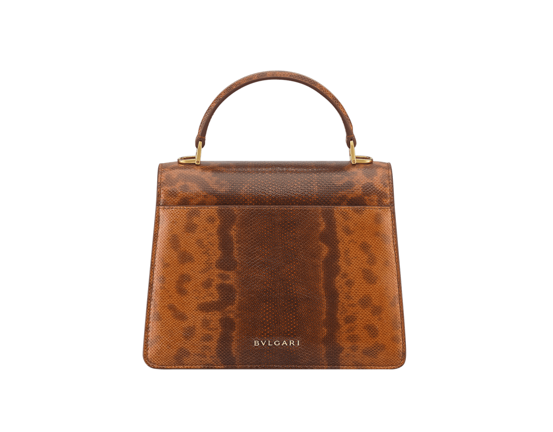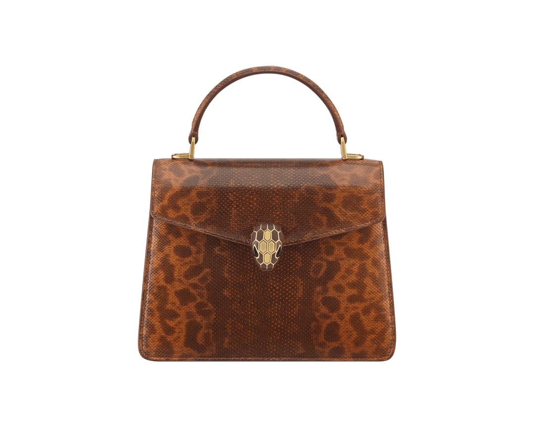 A display of the collection's ever-evolving charm, the Serpenti Forever medium top handle bag blends iconic design with a contemporary twist. Crafted in amber shiny karung, boasting a unique natural scale pattern exalted by a glossy finish, the easy-to-wear creation enriches its emblematic features with new details. Sporting a leather strap, this model is topped by the iconic snakehead magnetic closure whose mesmerizing scales and design draw from the Serpenti jewellery of the 60's. The bag is completed by a single compartment, a frontal pocket, an outer back patch pocket, an internal open pocket, a mirror pocket with customisable mirror and the Bvlgari metal logo on the back. Made in Italy.