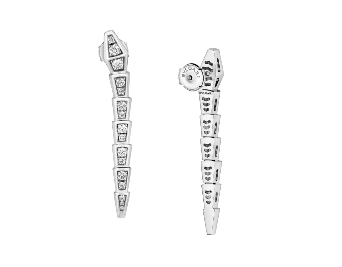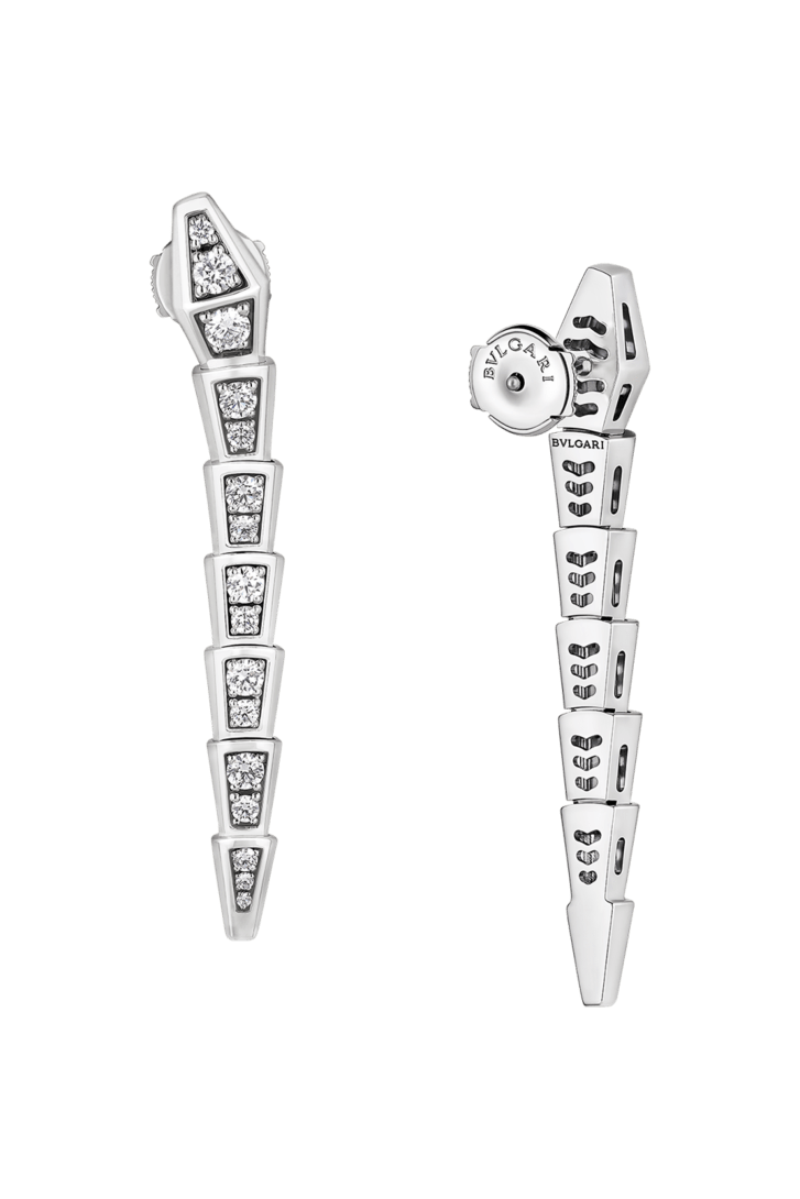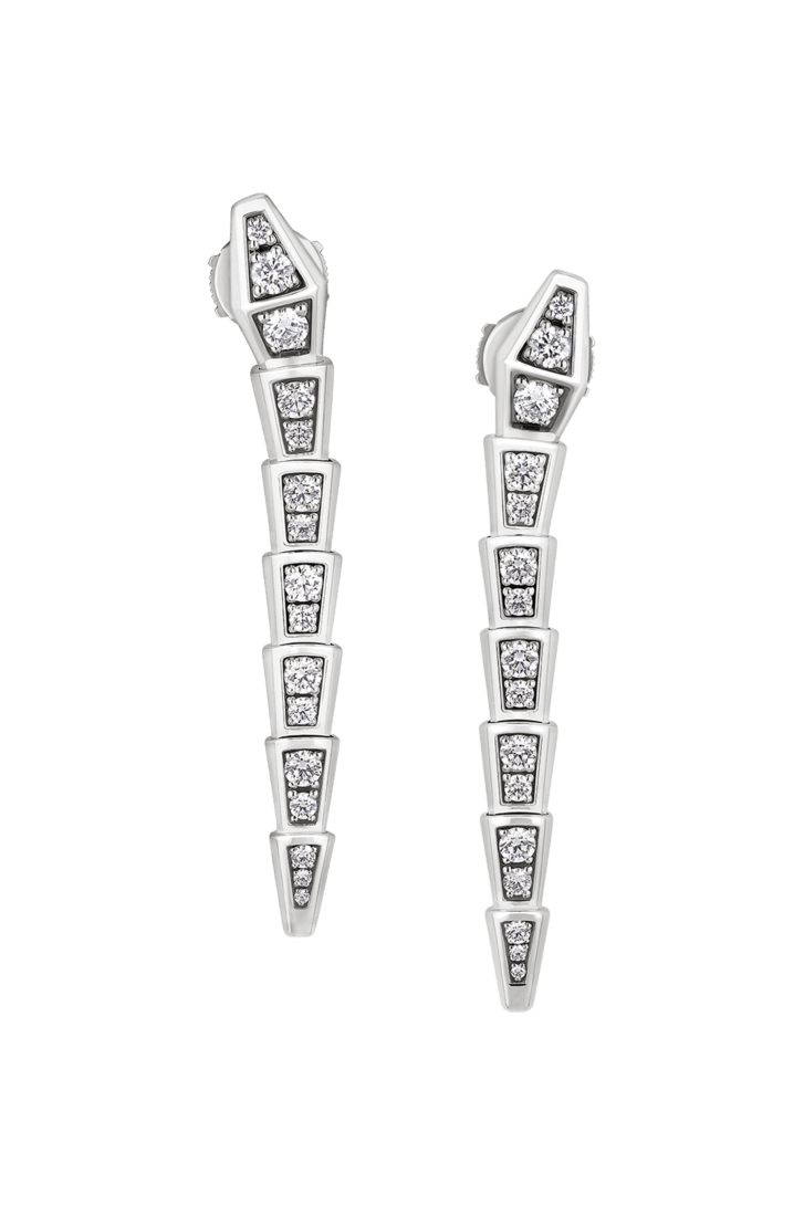 With their signature blend of pure aesthetics, enveloping shapes and charismatic flair, the Serpenti Viper 18 kt white gold pendant earrings with full pavé diamonds represent an essential interpretation of Bvlgari’s icon of perpetual metamorphosis. Capturing the powerful and ever-evolving nature of the mythical serpent, this magnetic jewellery creation inspires us to embrace change as a source of strength and self-confidence. Easy to mix and match, the earrings offer endless styling options, embodying the collection’s versatile spirit.