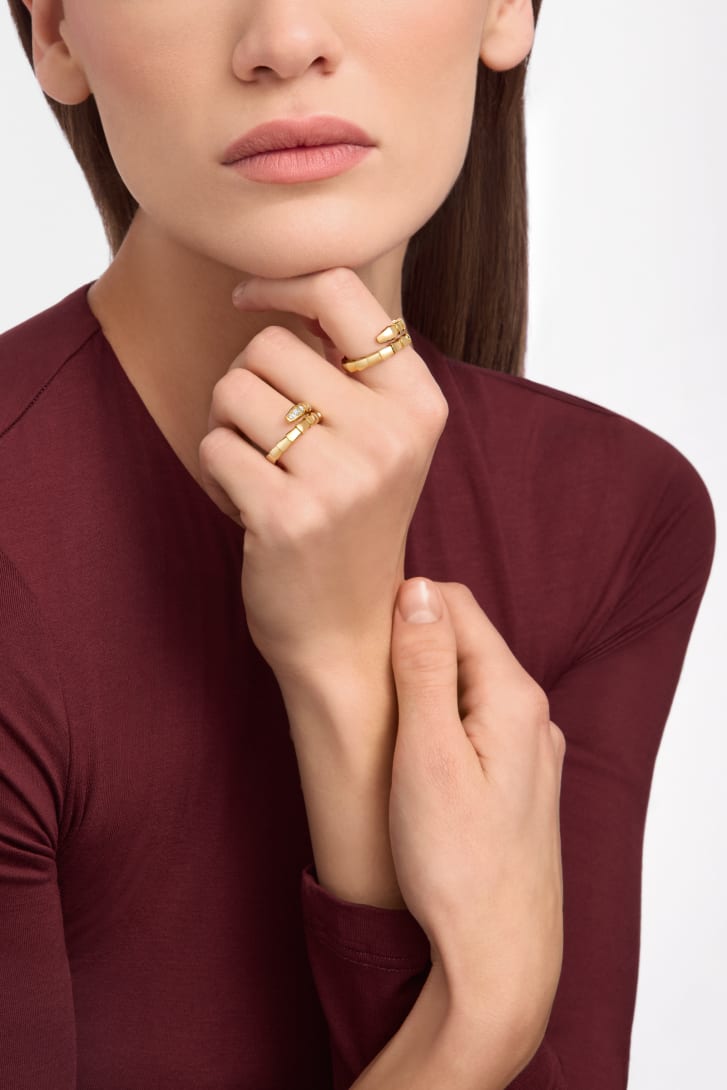 With its signature blend of pure aesthetics, enveloping shapes and charismatic flair, the Serpenti Viper 18 kt yellow gold ring is an essential interpretation of Bvlgari’s icon of endless metamorphosis. Capturing the powerful and ever-evolving nature of the mythical serpent, the magnetic jewellery creation inspires us to embrace change as a source of strength and self-confidence. Easy to mix and match, the ring offers endless styling options, embodying the collection’s versatile spirit.