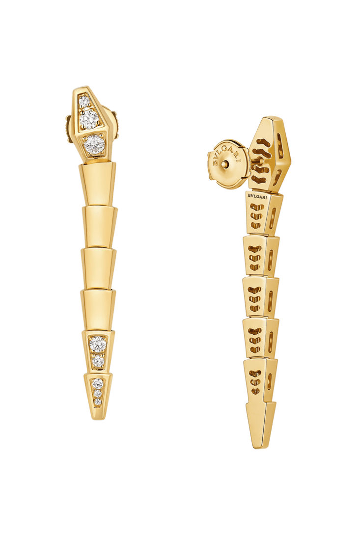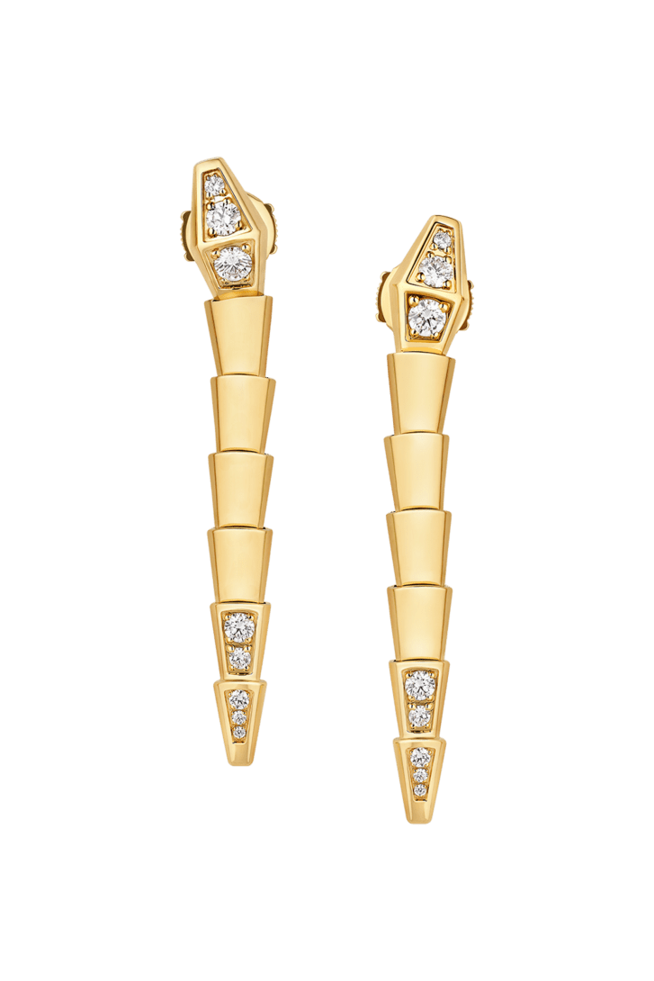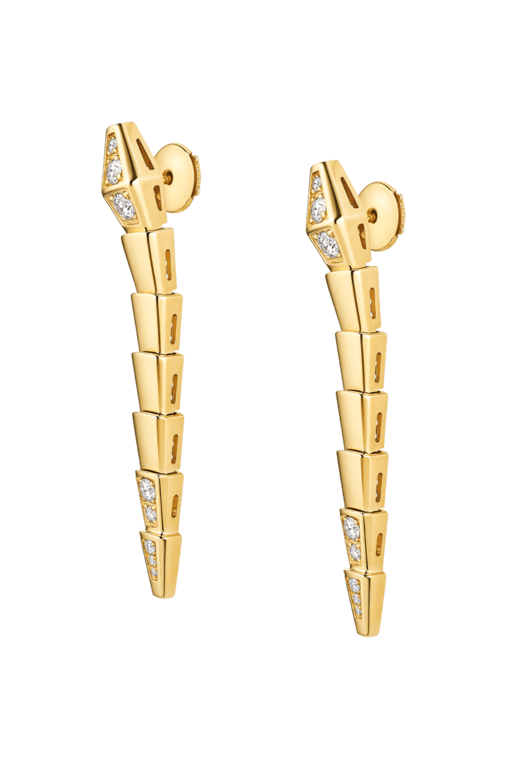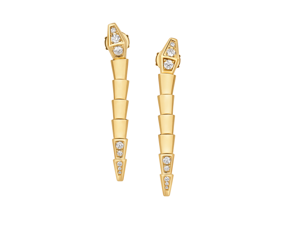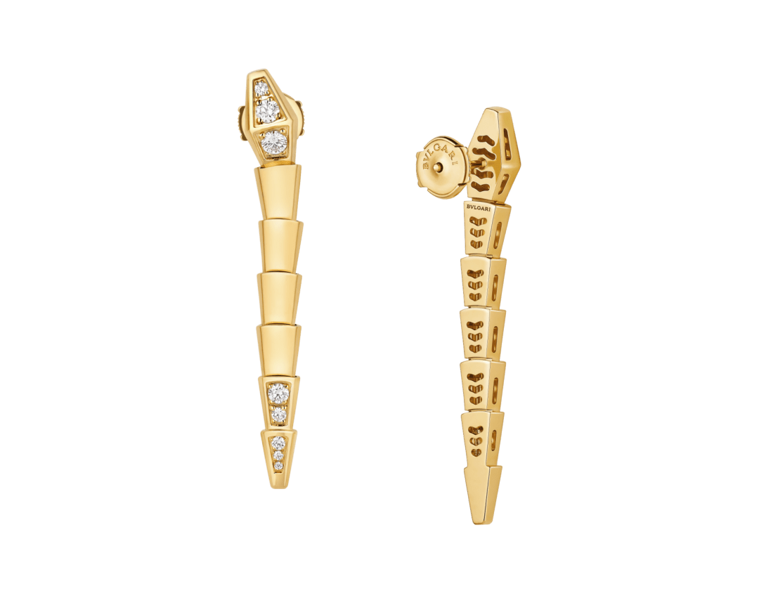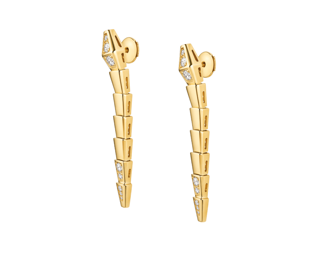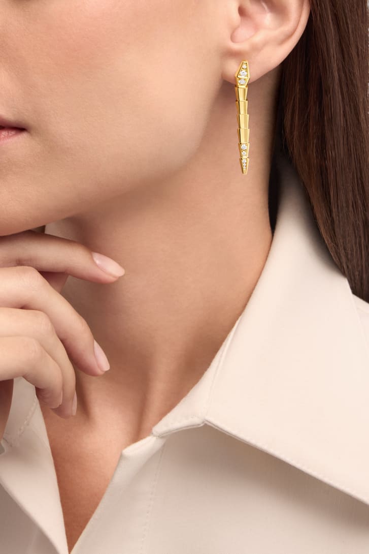 With their signature blend of pure aesthetics, enveloping shapes and charismatic flair, the Serpenti Viper 18 kt yellow gold pendant earrings with demi pavé diamonds represent an essential interpretation of Bvlgari’s icon of perpetual metamorphosis. Capturing the powerful and ever-evolving nature of the mythical serpent, this magnetic jewellery creation inspires us to embrace change as a source of strength and self-confidence. Easy to mix and match, the earrings offer endless styling options, embodying the collection’s versatile spirit.