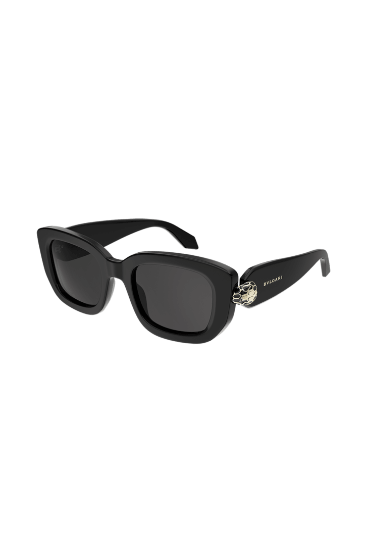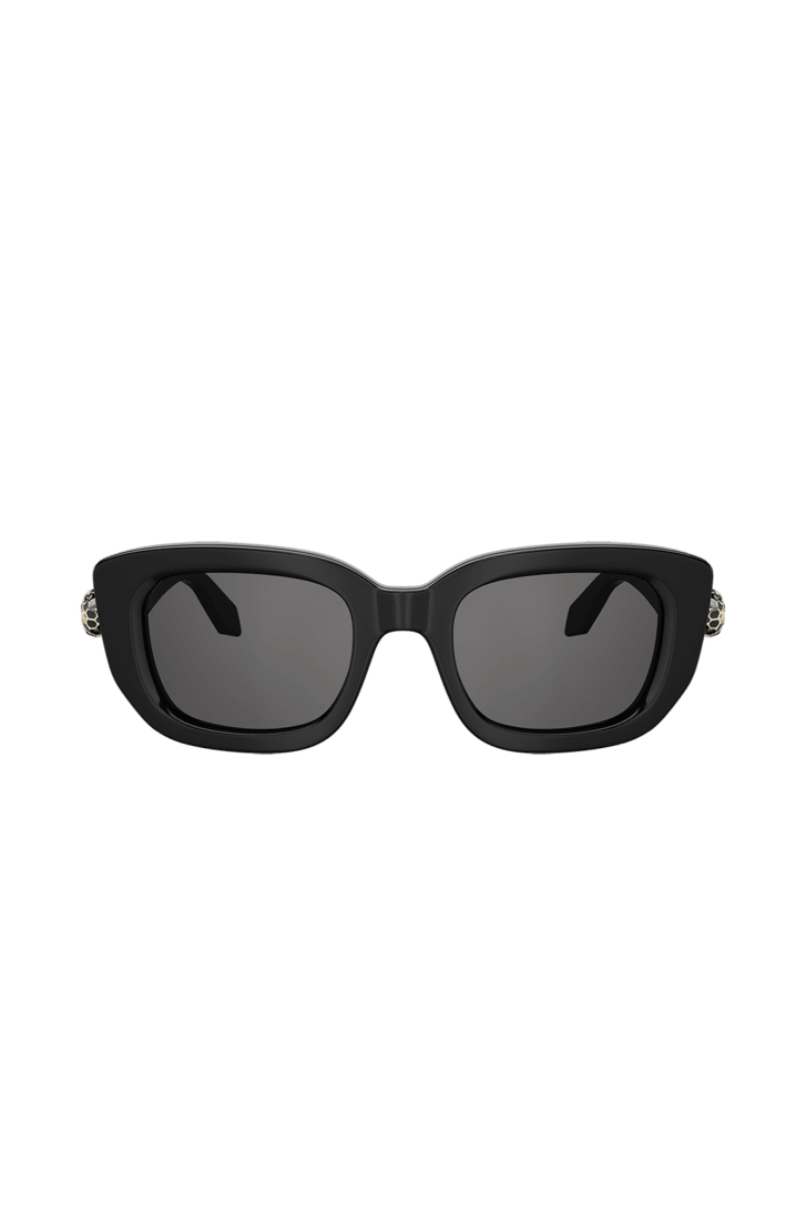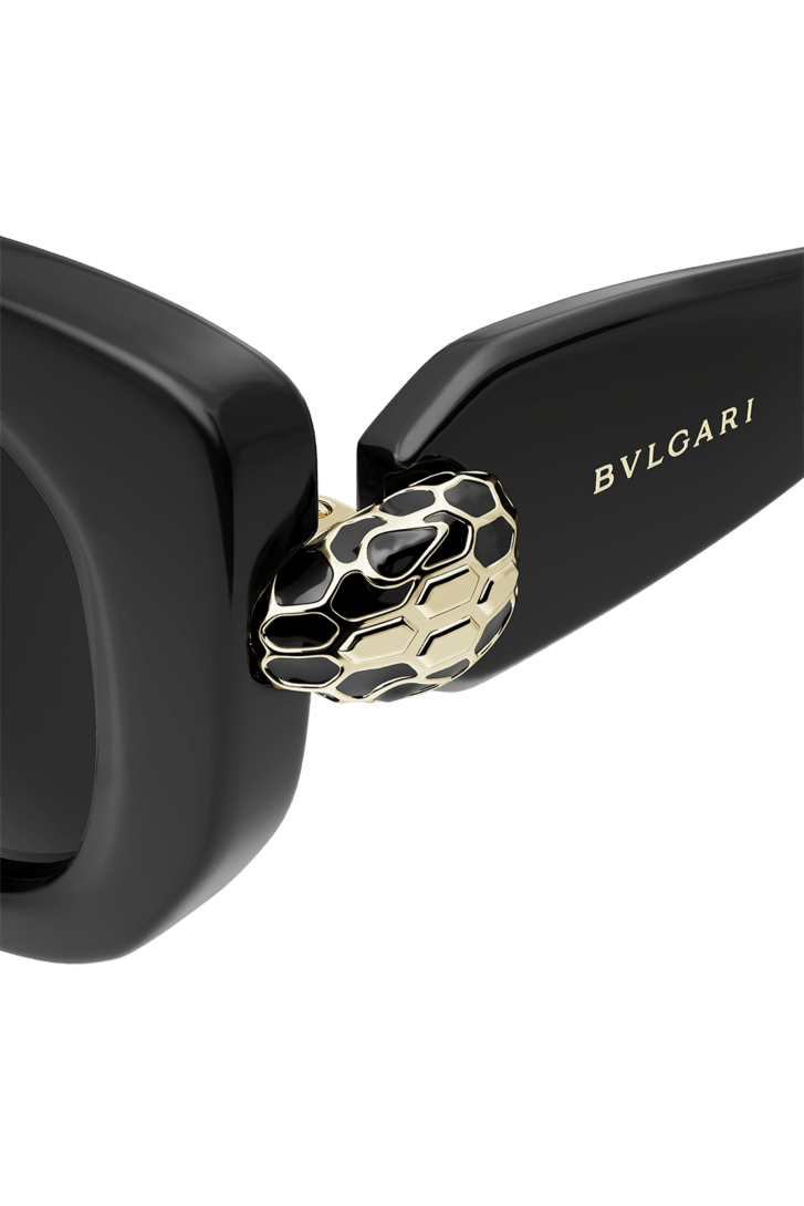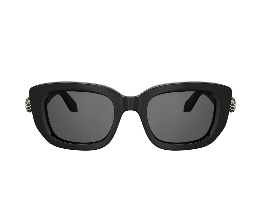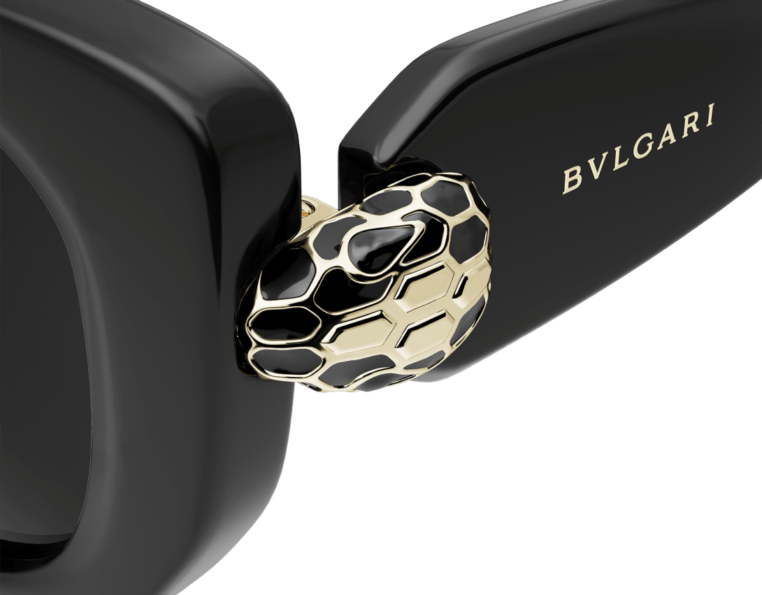 Serpenti Forever sunglasses featuring a rectangular frame in black acetate and smoke-coloured lenses. Inspired by the iconic clasp of Serpenti bags, the temples feature a precious snakehead hinge embellished with hand-applied enamel, making this style irresistibly captivating.