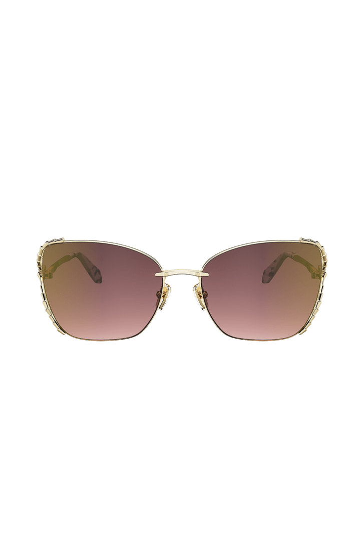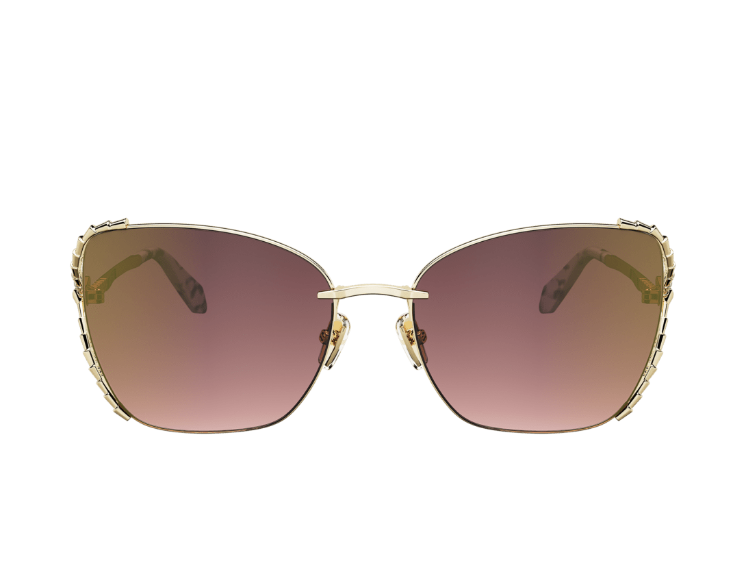 Serpenti Viper sunglasses featuring a rectangular metal frame and violet lenses. The temples are embellished with an intertwining scale motif inspired by the iconic Serpenti jewellery, infusing the style with a unique feminine touch.