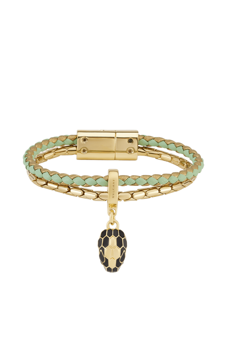 Serpenti Forever bracelet in light peridot and deep gold braided calf leather and gold-plated brass chain with magnetic clasp closure. Captivating snakehead charm with black enamel and gold-plated scales, and black enamel eyes.