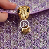 A blend of contemporary appeal, Roman inspiration and magnificent workmanship, the Serpenti Forever mini top handle bag is skilfully crafted in suede with hand-applied light amethyst and platinum Calla Crystals that form a sparkling leitmotif drawing from the fan-shaped polychrome mosaics of the Baths of Caracalla. Equipped with a snake body-shaped chain and leather strap, the creation is topped by the iconic snakehead press button closure whose mesmerizing design and scales, inspired by the Serpenti jewels of the 60's, display a diamond-cut effect, namely a grainy metallic texture that shimmers like a snow-set pavé. Featuring a single compartment, the model is completed by an internal flat pocket and a mirror pocket with customizable mirror. Made in Italy.