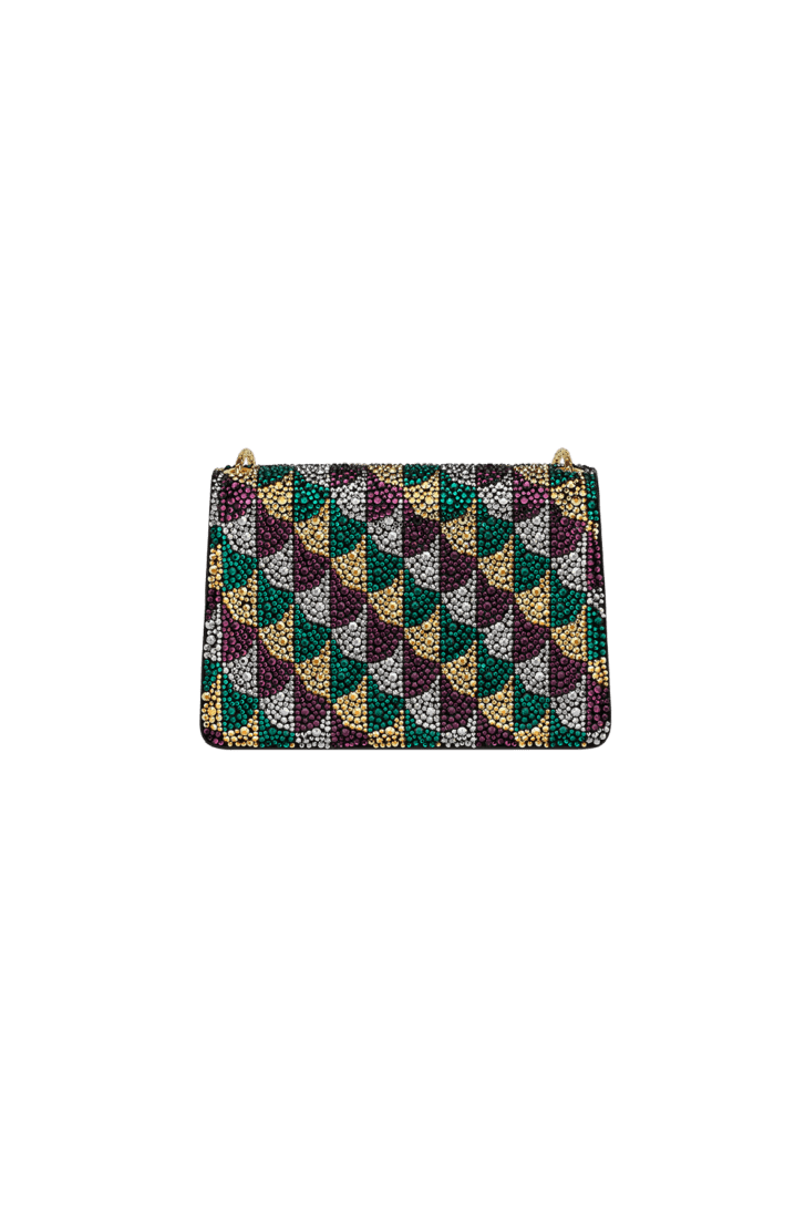 A hypnotic miniaturised interpretation of a timeless icon, the Serpenti Forever mini crossbody bag is masterfully crafted in black suede with hand-applied multicolour Calla Crystals that form a sparkling leitmotif drawing from the fan-shaped polychrome mosaics of the Baths of Caracalla, source of inspiration for the Divas' Dream jewellery line. Equipped with a snake body-shaped chain strap, the creation is topped with the iconic snakehead magnetic closure, whose mesmerising design and scales, inspired by the Serpenti jewellery of the 60s, display a diamond-cut effect, namely a grainy metallic texture that shimmers like a snow-set pavé. Featuring a single compartment, the model is completed with an internal pocket with diamond-shaped mirror. 17 x 11 x 5 cm - 6.7 x 4.3 x 2 inches. Made in Italy.
