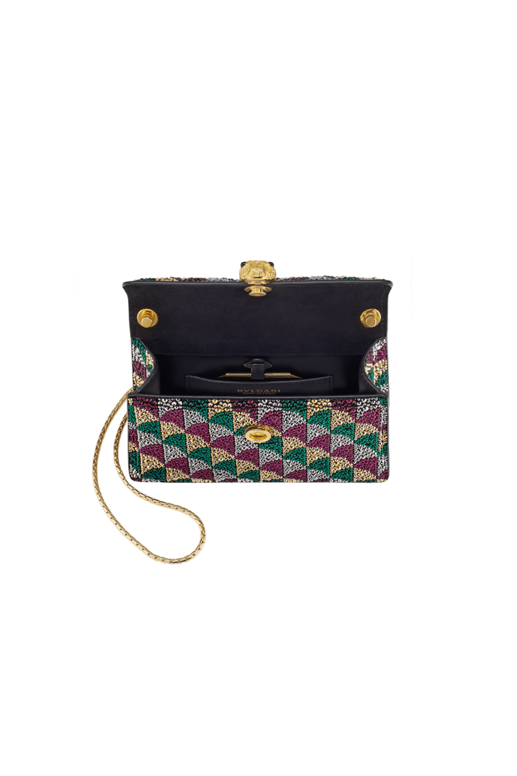 Serpenti Forever mini crossbody bag in multicolour Calla Crystals pattern applied on black suede and black nappa leather lining. Captivating snakehead magnetic closure in gold-plated brass embellished with diamond-cut engraving on the scales, and black onyx eyes.