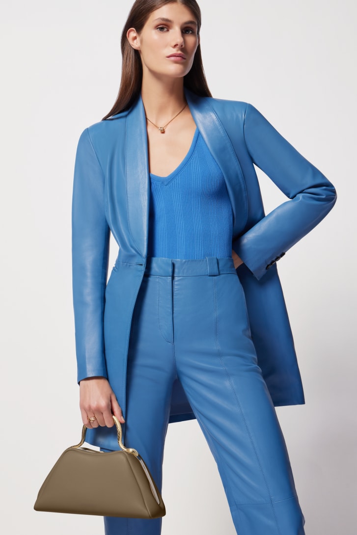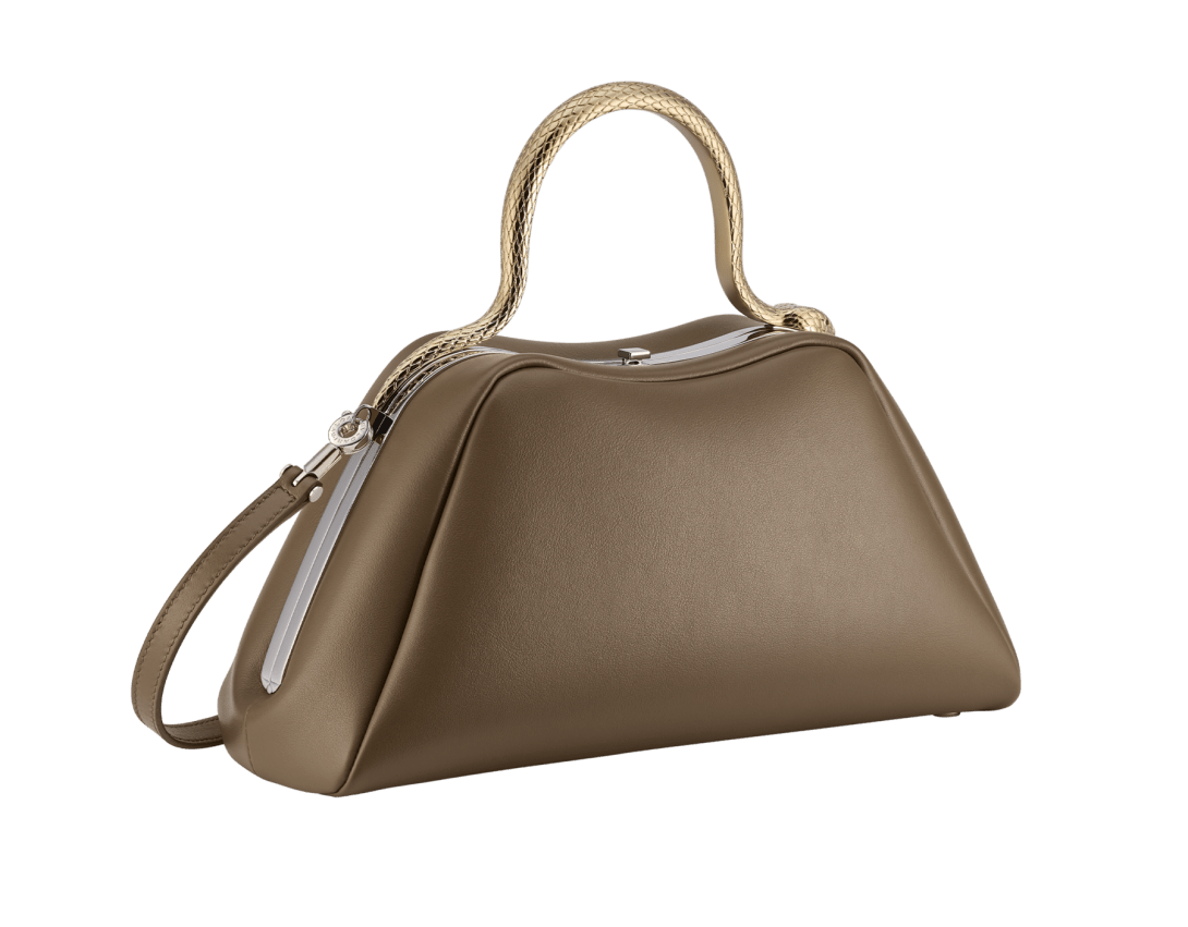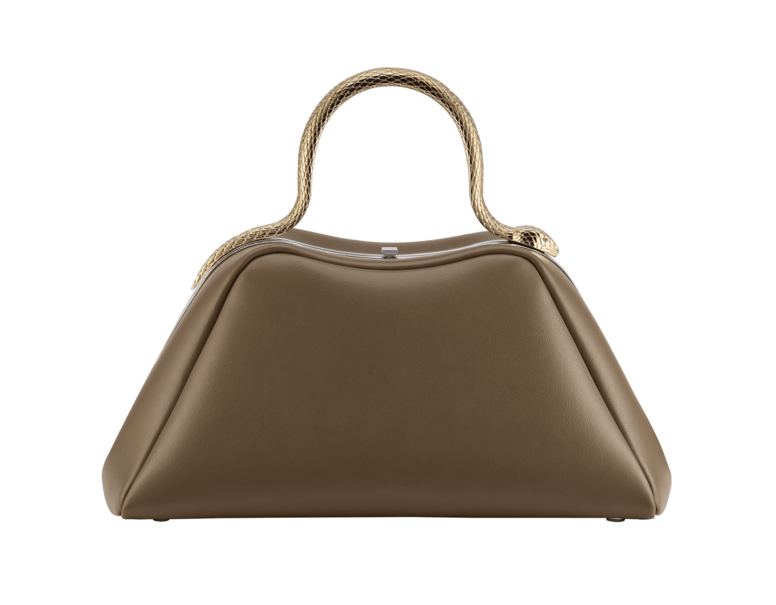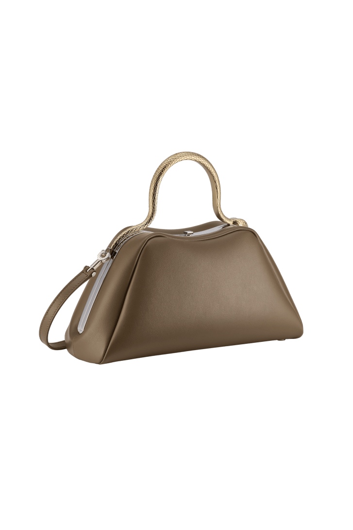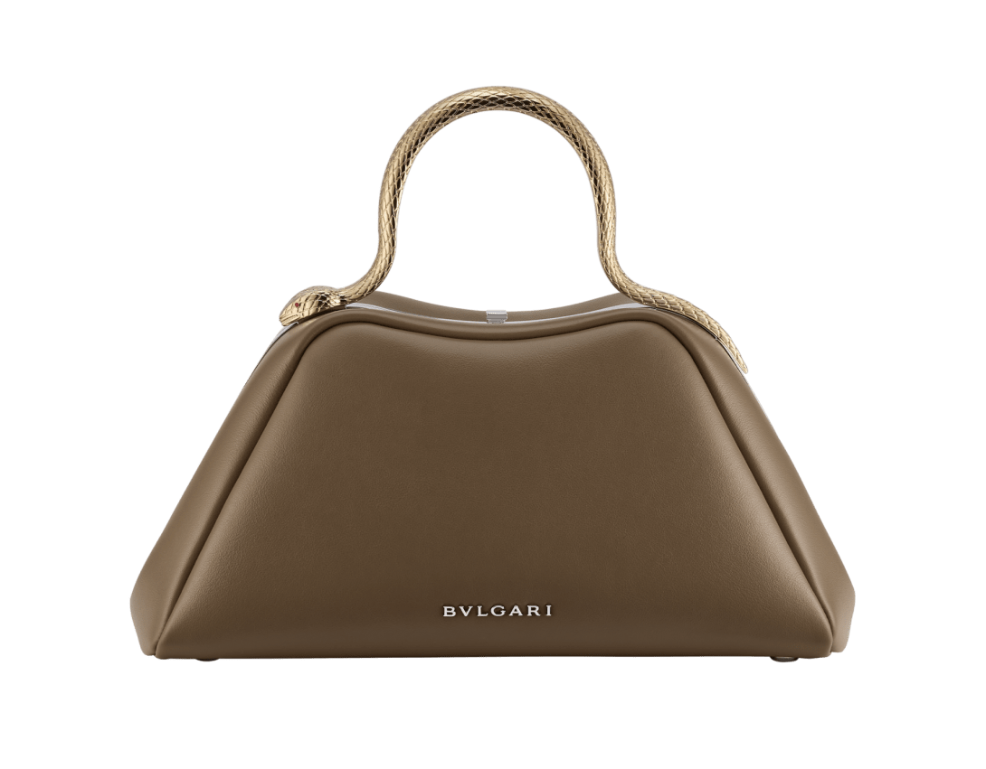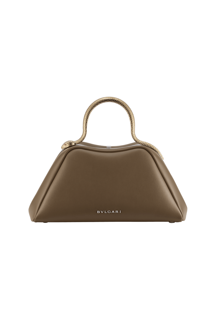 An audacious reinvention of a timeless icon, the day-to-night Serpentine small top handle bag in Roman granite brown smooth calf leather combines a rounded, rigid structure with a jewellery-inspired detail, evoking the serpent's sinuous moves. Featuring a light gold-plated brass snake body-shaped handle, inspired by the bold Serpenti heritage necklaces of the 1960s, and embellished with engraved scales and red enamel eyes, the bag features a leather strap. The model is completed with a single compartment, a press-button closure, an internal flat pocket and the Bvlgari metal logo on the back. 27 x 14 x 10 cm - 10.6 x 5.5 x 3.9 inches. Made in Italy.