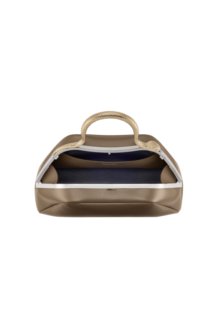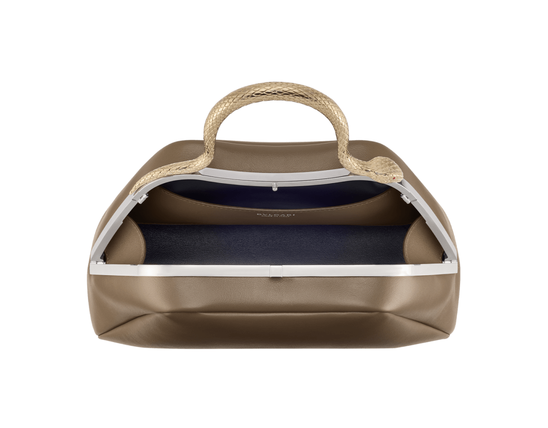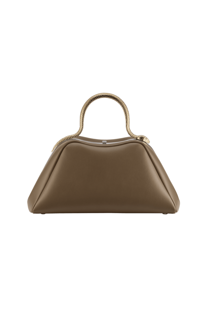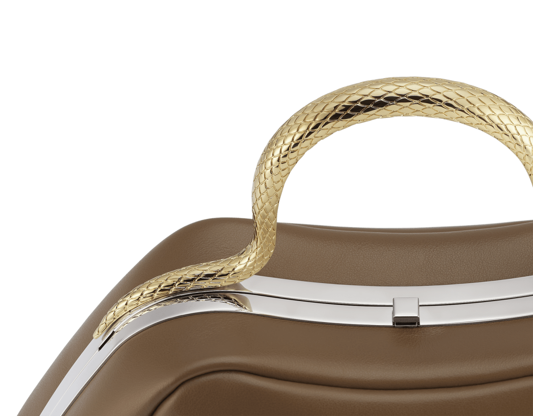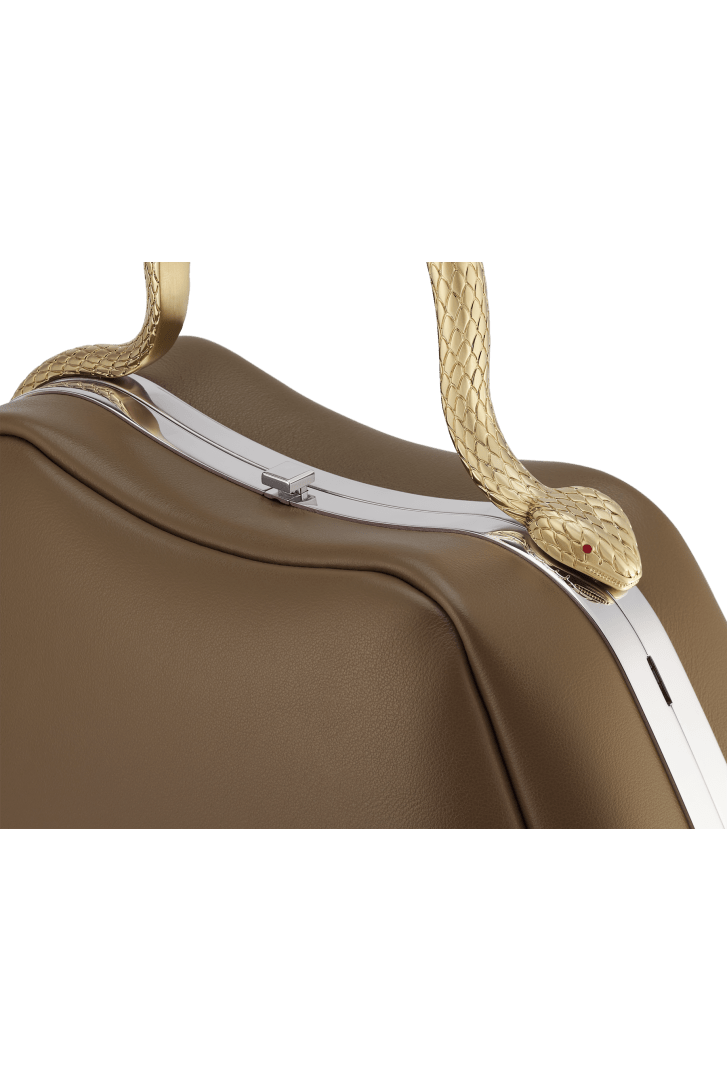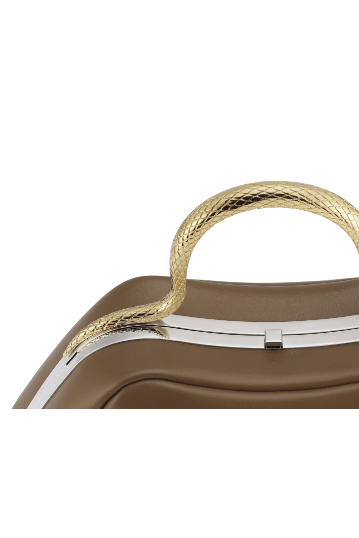 Serpentine small top handle bag in Roman granite brown smooth calf leather with black nappa leather lining. Captivating snake body-shaped top handle in light gold-plated brass embellished with engraved scales and red enamel eyes, press-button closure and palladium-plated brass hardware.