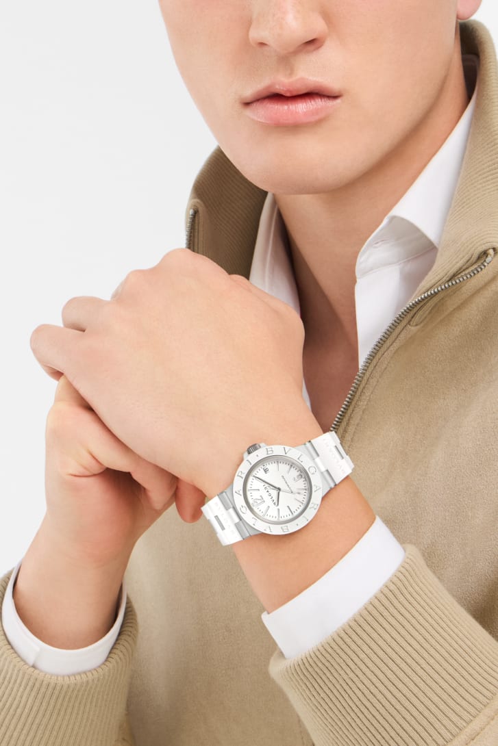 Boldly going beyond trends and eras, the Bvlgari Aluminium has redefined what a luxury sport watch can be. A pure expression of the icon’s unrivalled coolness and versatile appeal, this Bvlgari Aluminium White Automatic watch features a striking monochromatic white design. Crafted from bold and unconventional materials, it pairs a sandblasted aluminium case with a white rubber bezel and bracelet, completed by a varnish white opaline dial – speaking a universal language that approaches the watchmaking world with modern allure. Bvlgari Aluminium White Automatic watch with mechanical manufacture movement, automatic winding, hours, minutes, central seconds and date, B77 calibre (3.60 mm thick), 42-hour power reserve, 28,800 VpH (4 Hz). 40 mm sandblasted aluminium case, white rubber bezel with BVLGARI BVLGARI engraving, varnish white opaline dial with rhodium-plated indexes, polished rhodium-plated brass hour and minute hands filled with Super-LumiNova®, polished rhodium-plated brass central seconds hand with white lacquered end, date opening at 3 o’clock, sandblasted titanium crown, sandblasted and satin-finished titanium case back, white rubber bracelet with sandblasted aluminium links and pin buckle. Water-resistant up to 100 metres.