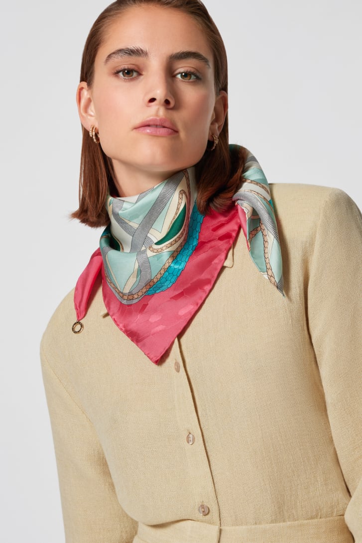 Crafted in fine truly tourmaline fuchsia silk twill and completed with a Bvlgari Bvlgari metal pendant, the Sinuous Chain scarf interprets Bvlgari’s most iconic jewellery chains into a captivating and sinuous design. From the legendary Tubogas to the famed snake body-shaped metallic strap, the Maison’s emblematic chains mould a mesmerizing snake, inspired by a Bvlgari Serpenti heritage jewellery creation. Offering multiple styling options, this versatile model can be tied around the neck for an iconic look, wrapped around the waist as a seductive belt and used to style the hair in on-trend ways or to personalise one’s bag. 70 x 70 cm - 27.6 x 27.6 inches. 100% silk twill. Handmade in Italy.