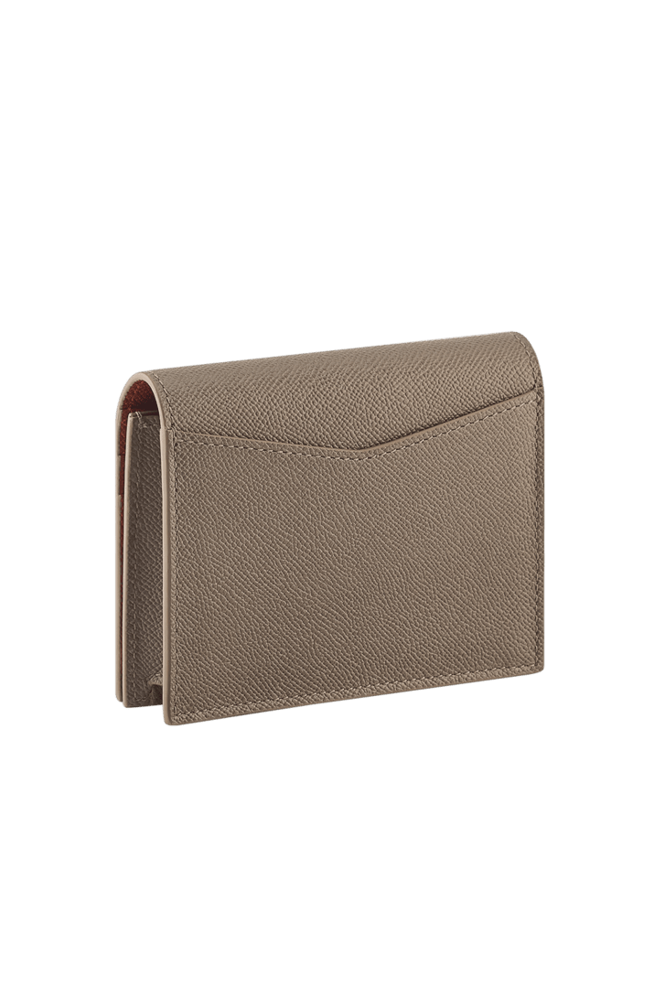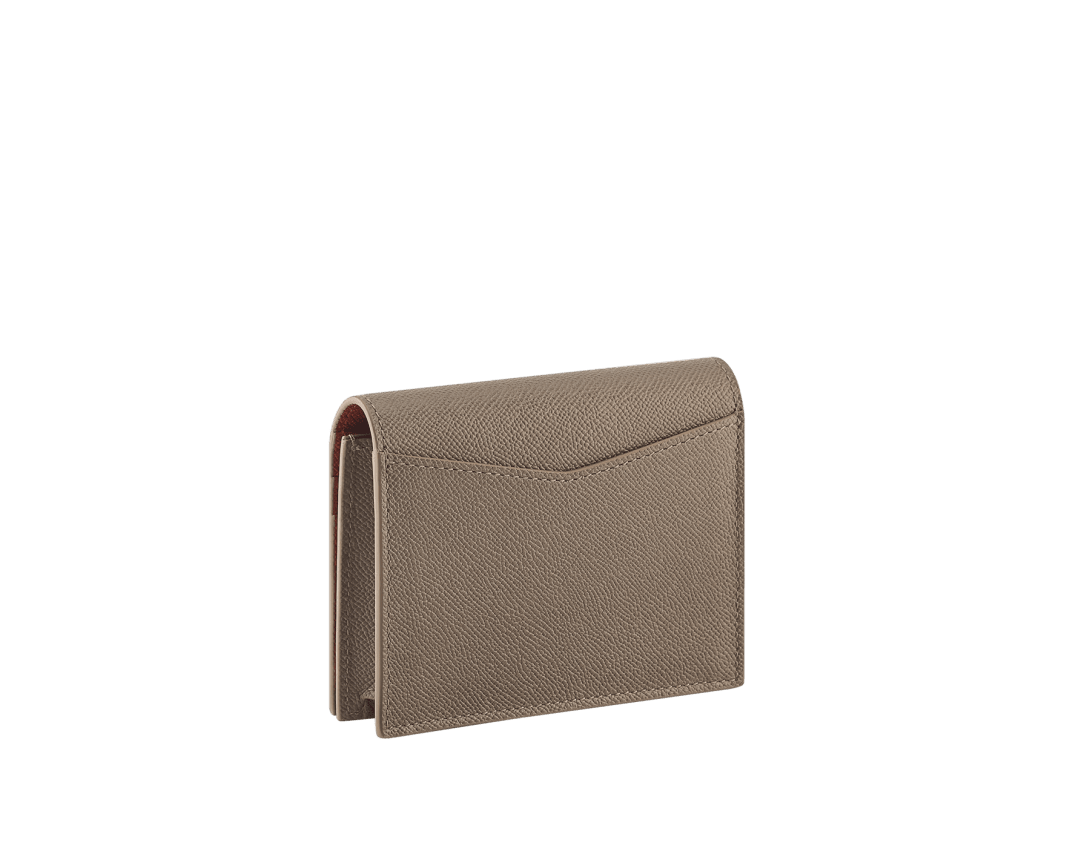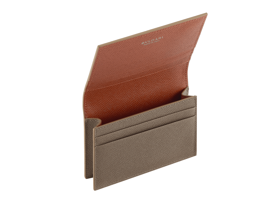 Bvlgari Bvlgari Man folded business card holder in grain calf leather, moonrock on the outside and amber on the inside. Iconic palladium-plated brass embellishment and folded closure.