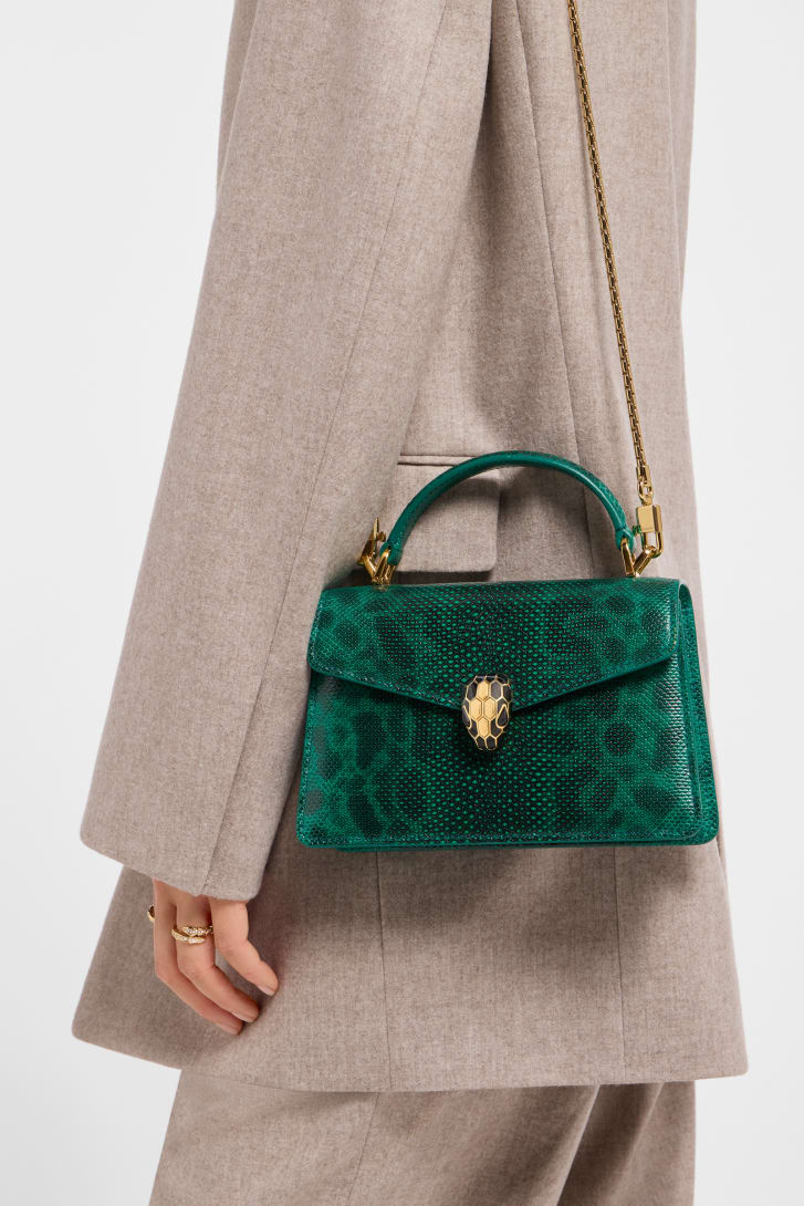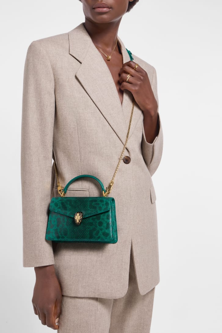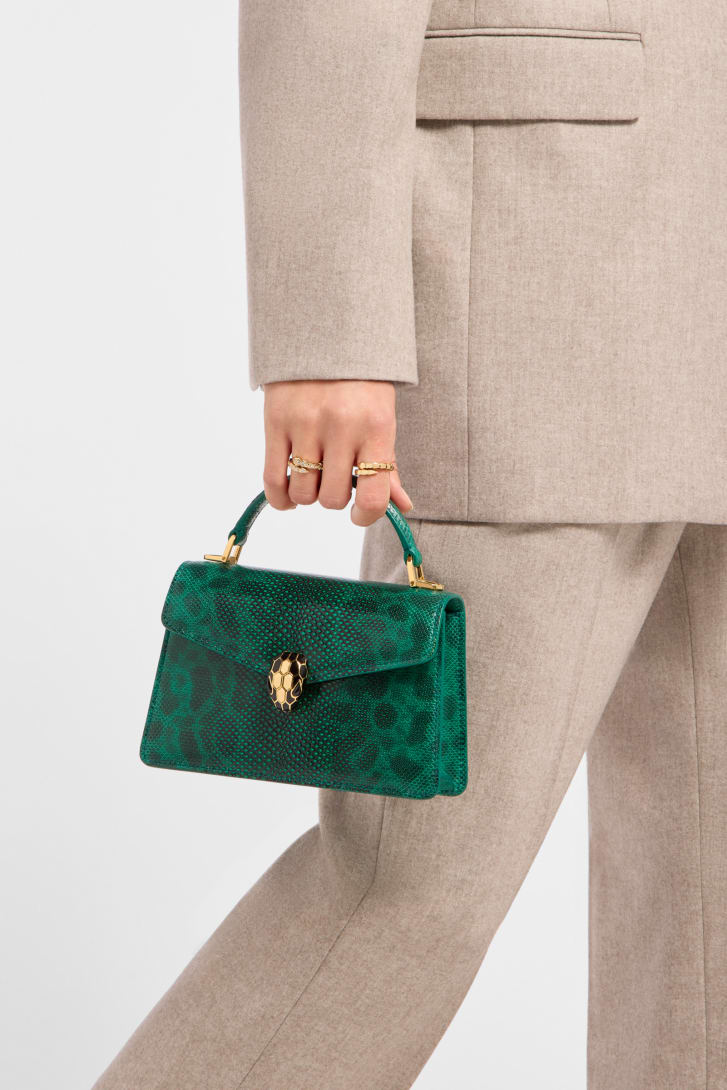 Contemporary and easy-to-wear, the on-trend Serpenti Forever mini top handle bag is skillfully crafted in Smeraldo Prezioso shiny karung, boasting a unique natural pattern enhanced by a glossy finish. Endowed with a snake body-shaped chain and leather strap, the creation is topped by the iconic snakehead magnetic closure, whose design and mesmerizing scales draw from the Serpenti jewels of the 1960s. Featuring a single compartment, the model is completed with a front pocket, a back patch pocket, an internal open pocket, a mirror pocket with a customizable mirror, and the Bvlgari metal logo on the back. 19 x 11 x 5.5 cm - 7.5 x 4.3 x 2.2 inches. Made in Italy.