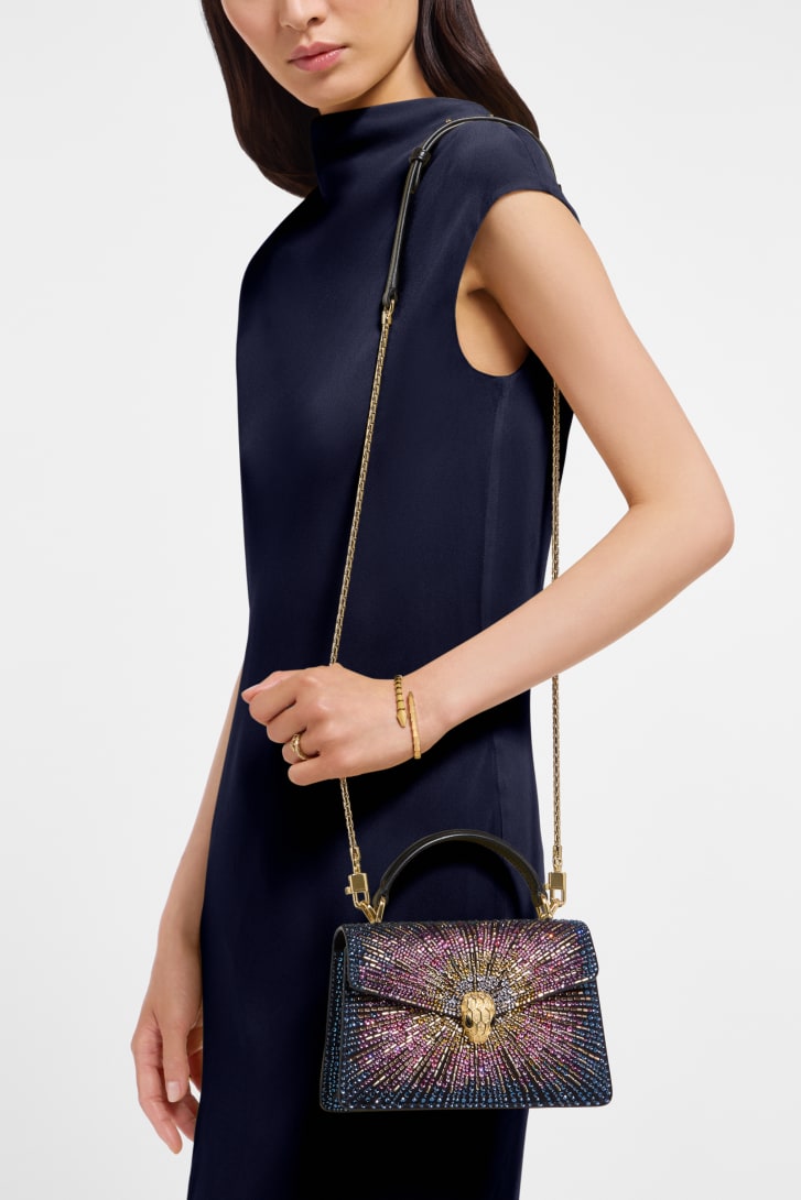 Contemporary and easy-to-wear, the on-trend Serpenti Forever mini top handle bag is artfully crafted in black suede with hand-applied multigradient Fireworks Crystals that form a sparkling and mesmerizing creative motif. Endowed with a snake body-shaped chain and leather strap, the creation is crowned by the iconic snakehead magnetic closure, whose mesmerizing design and scales, inspired by the Serpenti jewels of the 1960s, display a diamond-cut effect, namely a grainy metallic texture that shimmers like a snow-set pavé. Featuring a single compartment, the model is completed with an internal open pocket and a mirror pocket with a customizable mirror. 19 x 11 x 5.5 cm - 7.5 x 4.3 x 2.2 inches. Made in Italy.