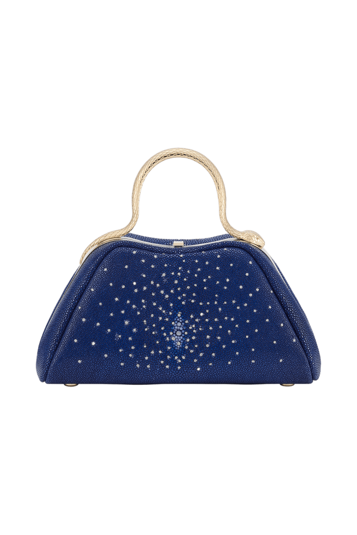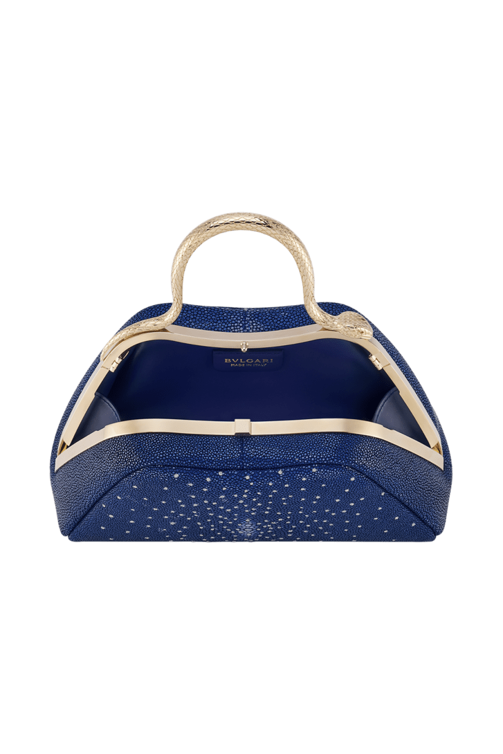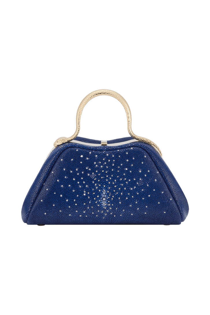 Serpentine mini top handle bag in lapis Diamond Dust galuchat with lapis nappa leather lining. Captivating snake body-shaped top handle in light gold-plated brass embellished with engraved scales and red enamel eyes and a press-button closure.