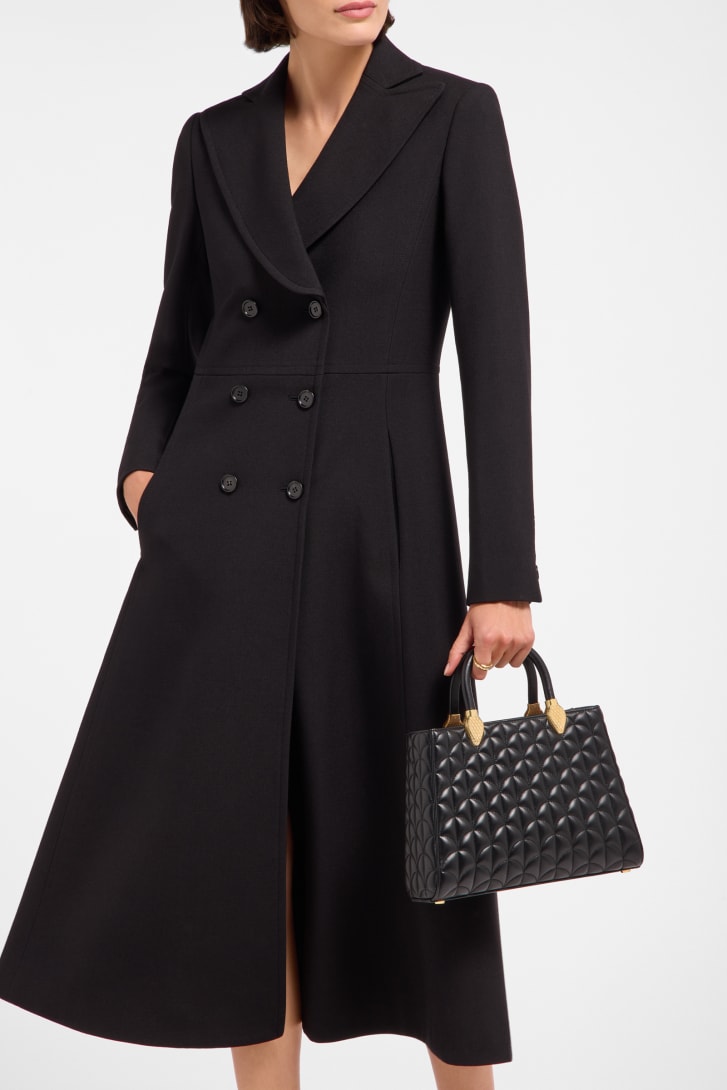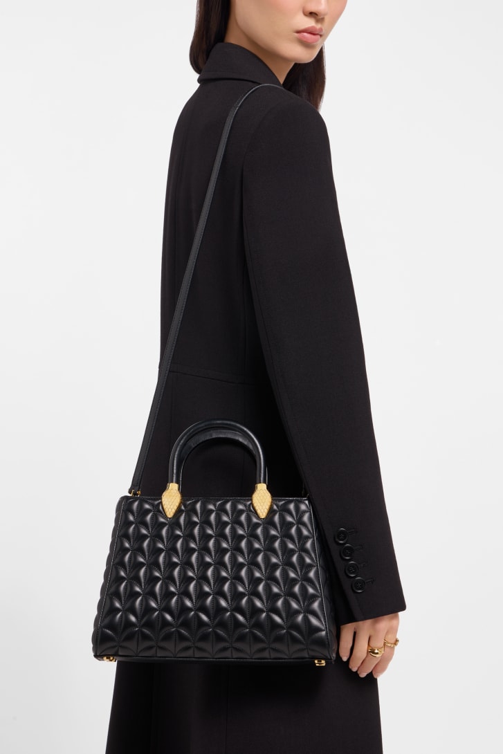 The sophisticated yet functional Serpentine Day Duo top handle bag features a roomy, lightweight silhouette that recalls the faceted cut of precious gems. Crafted in black calf leather and animated by the Calla matelassé motif, the bag boasts a luxurious quilted pattern evoking the fan-shaped polychrome mosaics of the Baths of Caracalla, a source of inspiration for the Divas' Dream jewelry line. Its two snake body-shaped handles, whose design draws from a bold 1960s Serpenti Bvlgari watch, are enriched with matching calf leather inserts, for added comfort and tactile appeal. The model is completed with a single compartment and an internal flat pocket. 28 x 19 x 8 cm - 11 x 7.5 x 3.1 inches. Made in Italy.