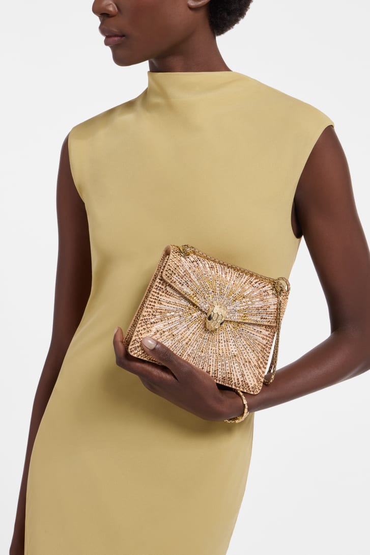 A modern evolution of a timeless model, the Serpenti Forever Day-to-Night small shoulder bag displays a contemporary metamorphosis of its versatile and iconic design, elevated by magnificent workmanship. Skillfully crafted in bright Travertino suede, the bag is covered with hand-applied gold Fireworks Crystals that form a sparkling and mesmerizing creative motif. Endowed with a sliding snake body-shaped chain strap, the creation is topped by the iconic snakehead magnetic closure, whose mesmerizing design and scales, inspired by the Serpenti jewels of the 1960s, display a diamond-cut effect, namely a grainy metallic texture that shimmers like a snow-set pavé. Featuring a single compartment, the model is completed with an internal open pocket and a mirror pocket with a customizable mirror. 19 x 14 x 4 cm - 7.5 x 5.5 x 1.6 inches. Made in Italy.