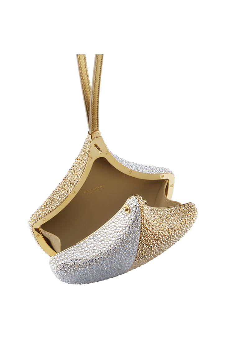 Masterfully crafted in suede and covered with hand-applied silver and champagne gold Neige Pavé Crystals, the Ginkgo clutch is a sparkling celebration of the refined Calla motif – inspired by the mosaics of the Baths of Caracalla – in its purest form. A unique blend of Roman inspiration and iconic design, exquisite leather goods craftsmanship and jewelry-making savoir faire, the evening bag is elegantly suspended from a leather bracelet and features a single compartment. 16 x 16.5 x 5 cm - 6.3 x 6.5 x 2 inches. Made in Italy.