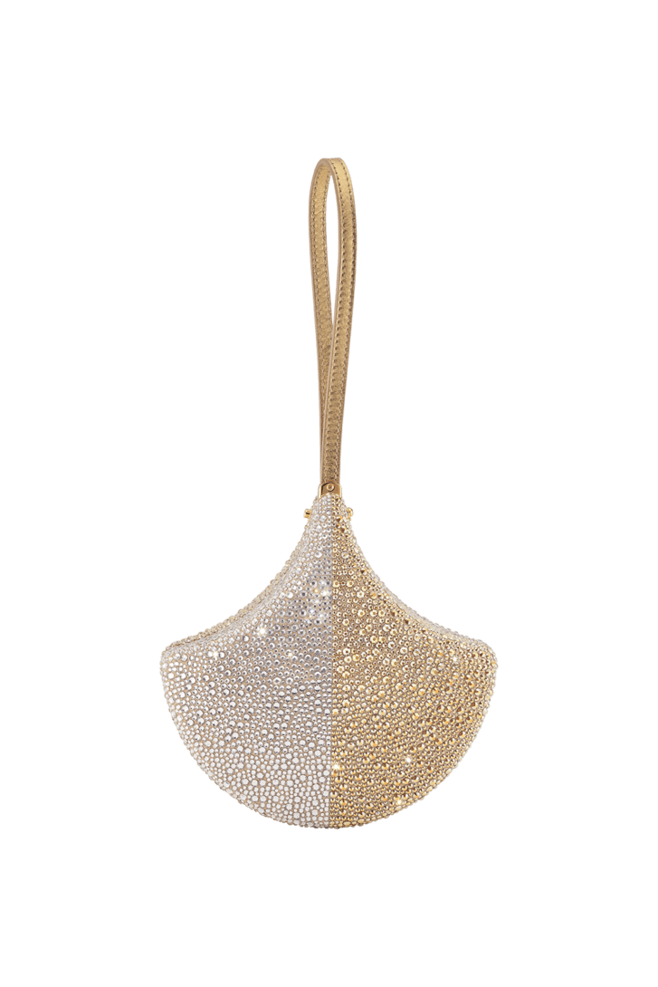 Ginkgo clutch in silver and champagne gold Neige Pavé Crystals applied on suede with Bright Travertino nappa leather lining and a leather wristlet.