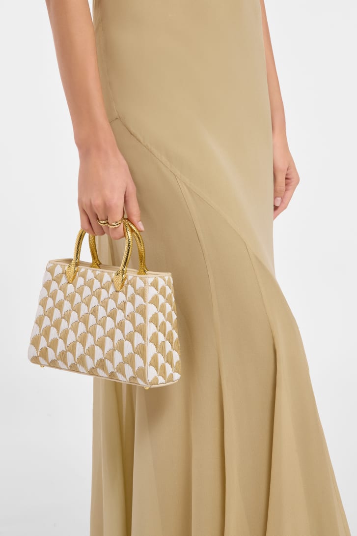 Exuding a sophisticated appeal, the Serpentine Duo tote bag combines jewelry-inspired details, evoking the serpent's sinuous movements, with magnificent workmanship and Roman inspiration. Skillfully crafted in ivory opal calfskin with a hand-embroidered Calla motif in white and natural raffia, this creation presents a textured seasonal interpretation of the fan-shaped design inspired by the polychrome mosaics of the Baths of Caracalla. Featuring two snake body-shaped handles embellished with engraved scales, whose design draws inspiration from a bold 1960s Serpenti watch, the model is completed by a leather strap, a flap closure for added functionality, a single compartment, an internal flat pocket and a zippered pocket. Made in Italy.