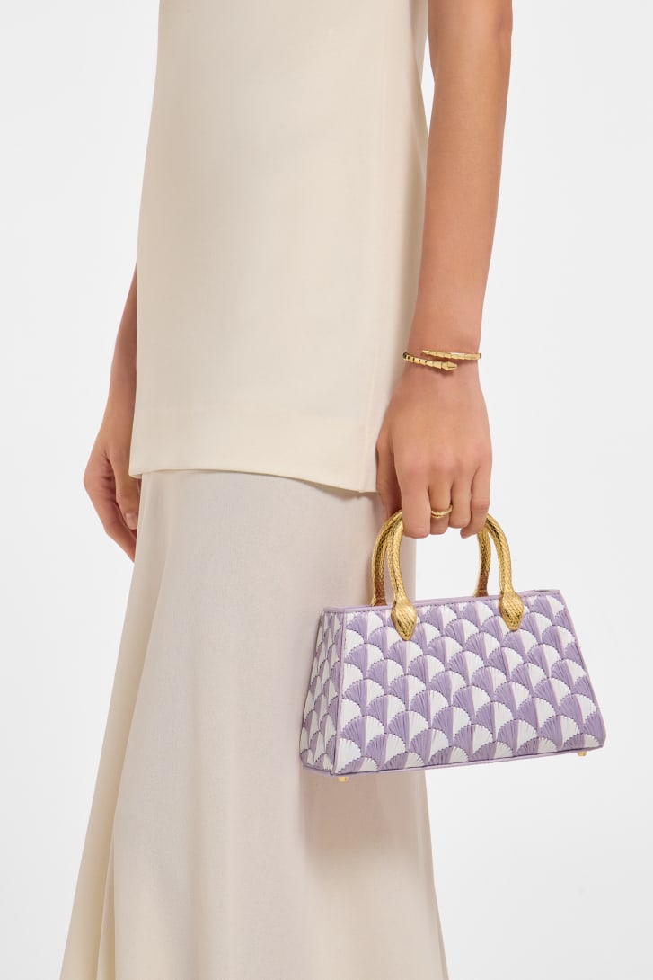 A blend of jewelry-inspired details, evoking the serpent's sinuous movements, magnificent workmanship and Roman inspiration, the Serpentine Duette bag is hand-crafted in light amethyst calfskin with a hand-embroidered Calla motif in white and light amethyst raffia, a textured seasonal interpretation of the fan-shaped design inspired by the polychrome mosaics of the Baths of Caracalla. Exuding glamorous sophistication through its compact trapeze shape and refined motif, it features two snake body-shaped handles embellished with engraved scales, whose design draws inspiration from a bold 1960s Serpenti watch. The model is completed by a leather strap, a single open compartment and an internal flat pocket. Made in Italy.