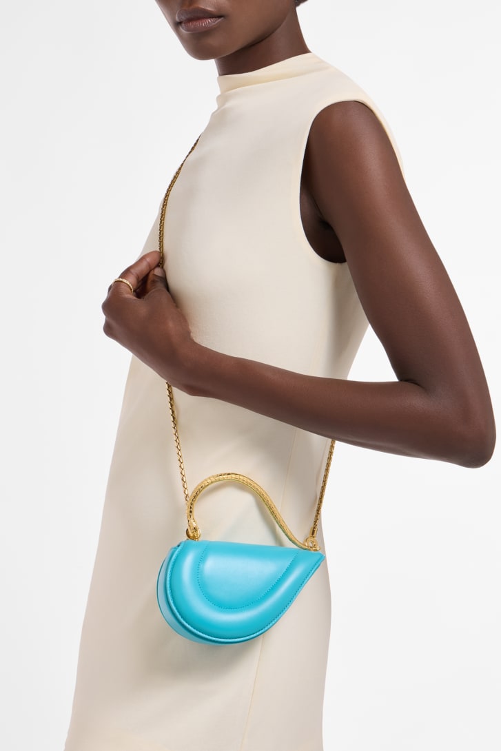 Reimagining the distinctive heart shape in a more compact size as a jewel-like miniature, the Serpenti Cuoricino mini top handle bag is crafted in premium matelassé feroza turquoise calf leather, showcasing a visually appealing and soft padded effect. Drawing inspiration from Bvlgari’s archives and unrivaled jewelry DNA, the bag’s serpentine metallic handle recalls a famed Serpenti jewelry watch from 1968. The distinctive snake body-shaped chain is detachable, allowing it to be worn in different ways. Featuring a single compartment, the model is completed by a press-button closure and two internal card pockets. Made in Italy.