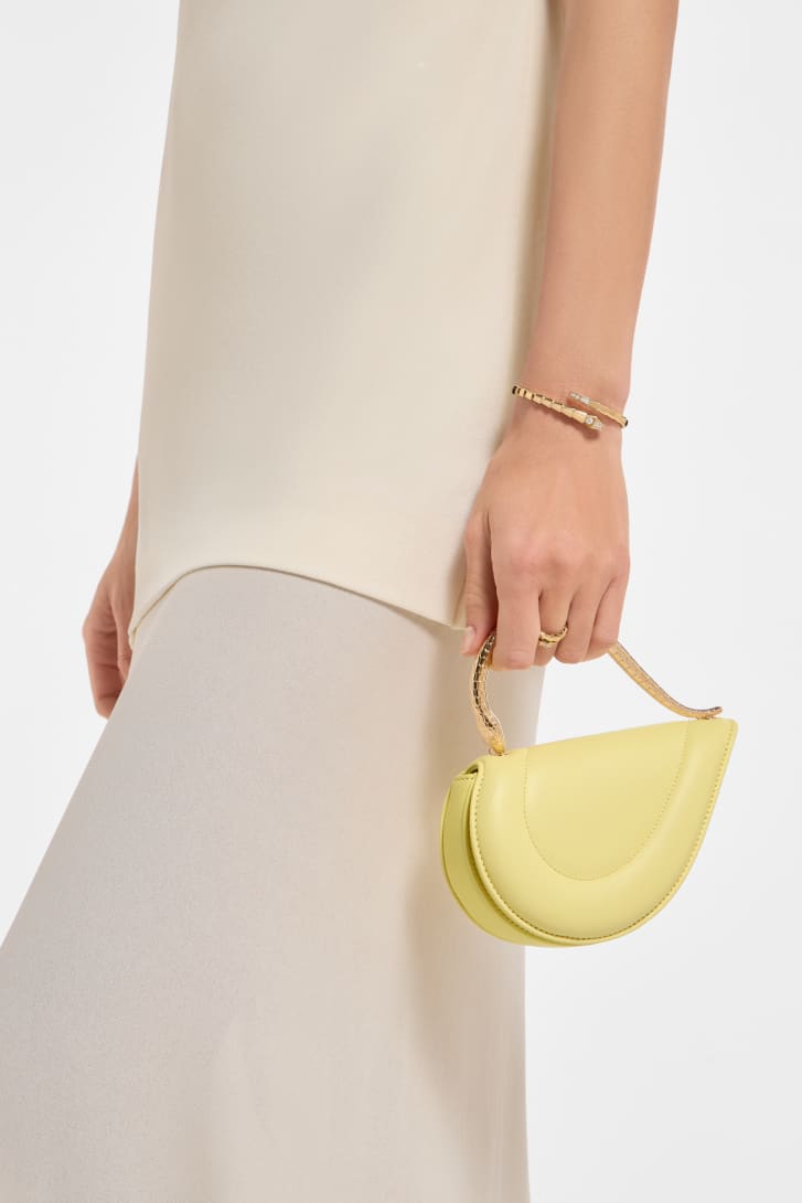 Serpenti Cuoricino mini top handle bag in sunbeam citrine calf leather with sunbeam citrine nappa leather lining. Captivating snake body-shaped top handle in gold-plated brass embellished with engraved scales; press-button closure.
