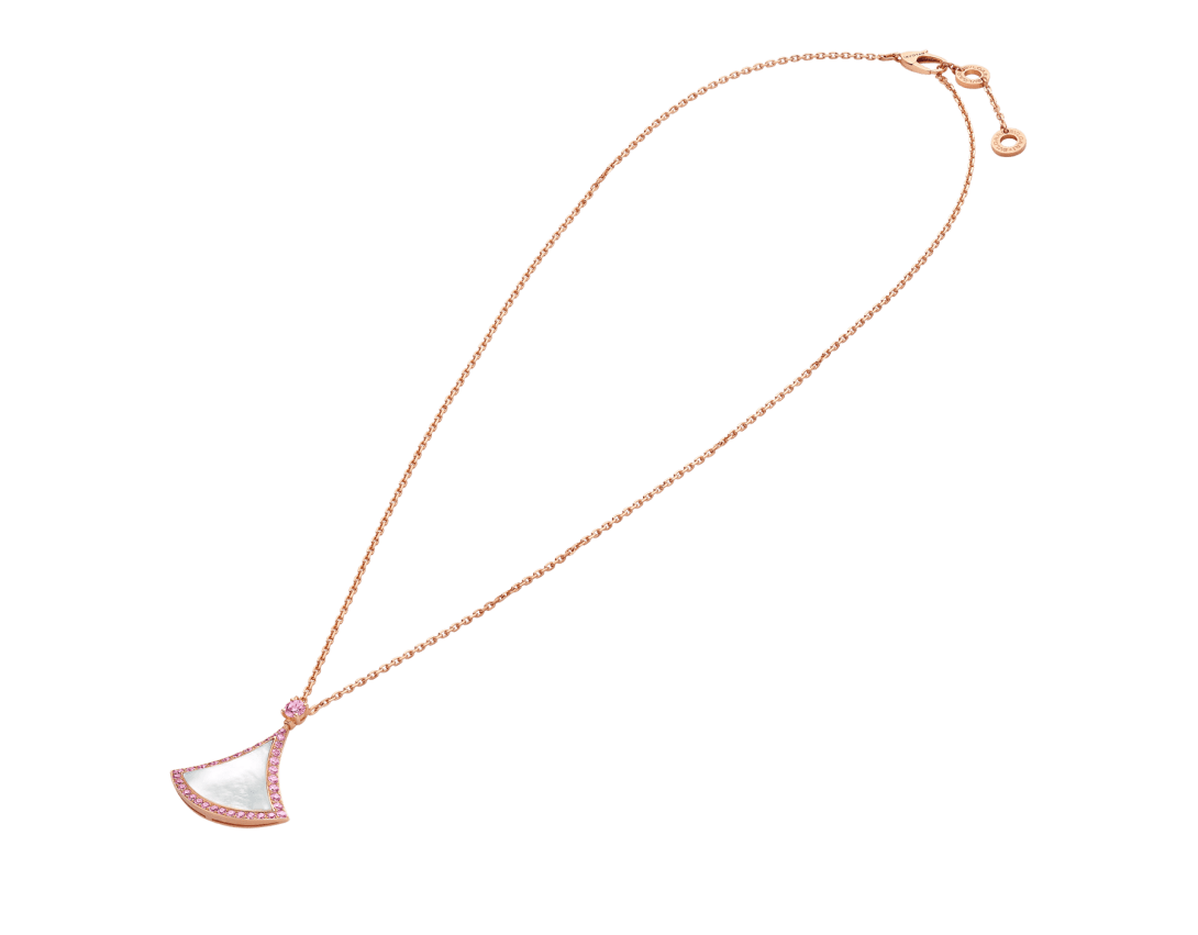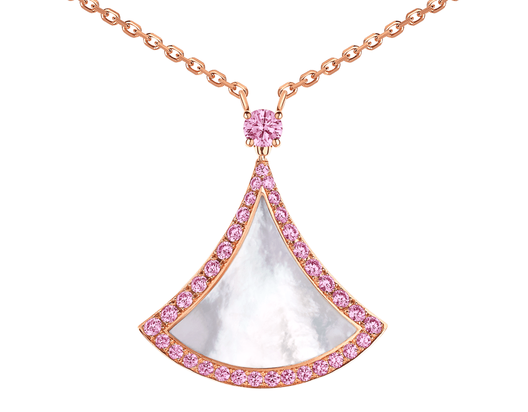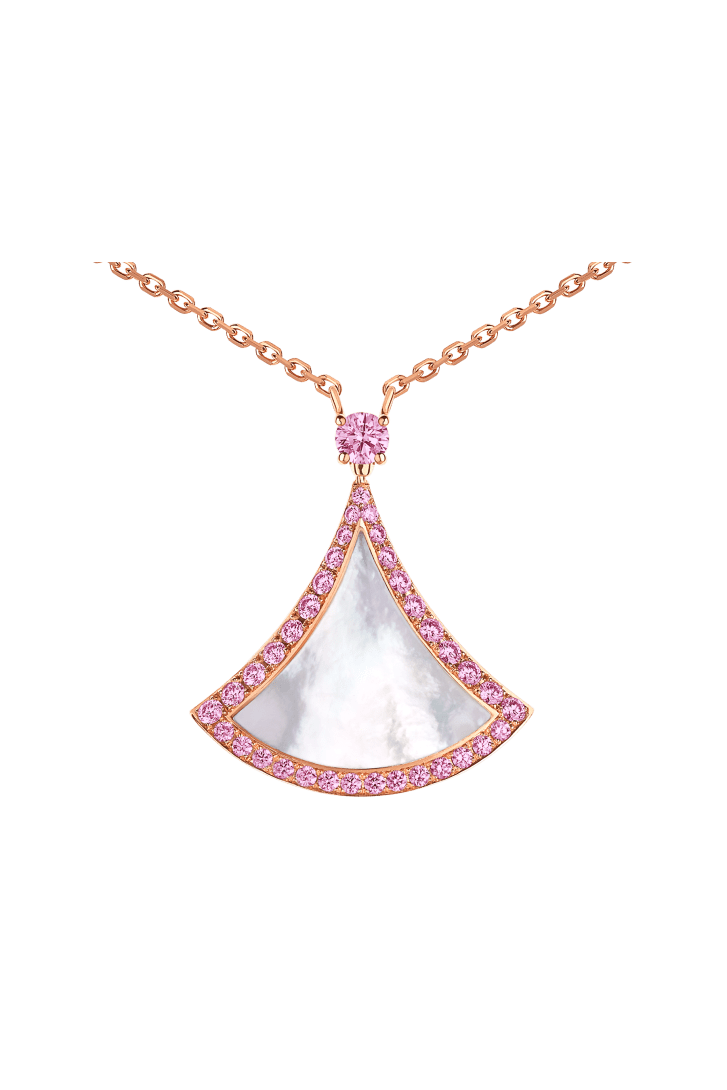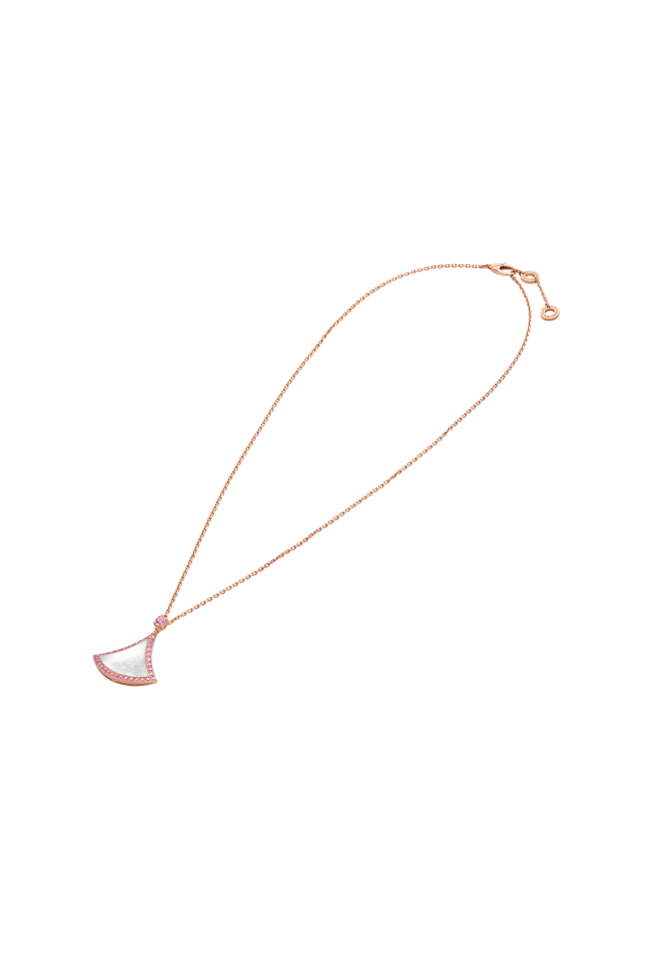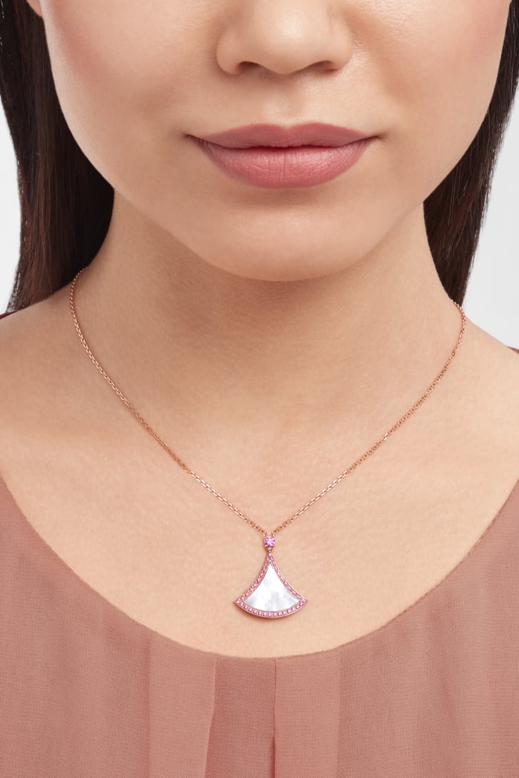 Divas' Dream 18 kt rose gold necklace with mother-of-pearl insert and pink sapphires.