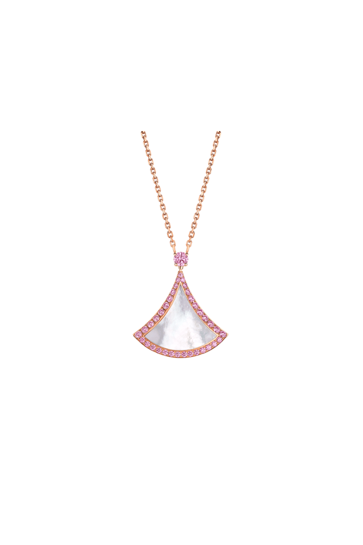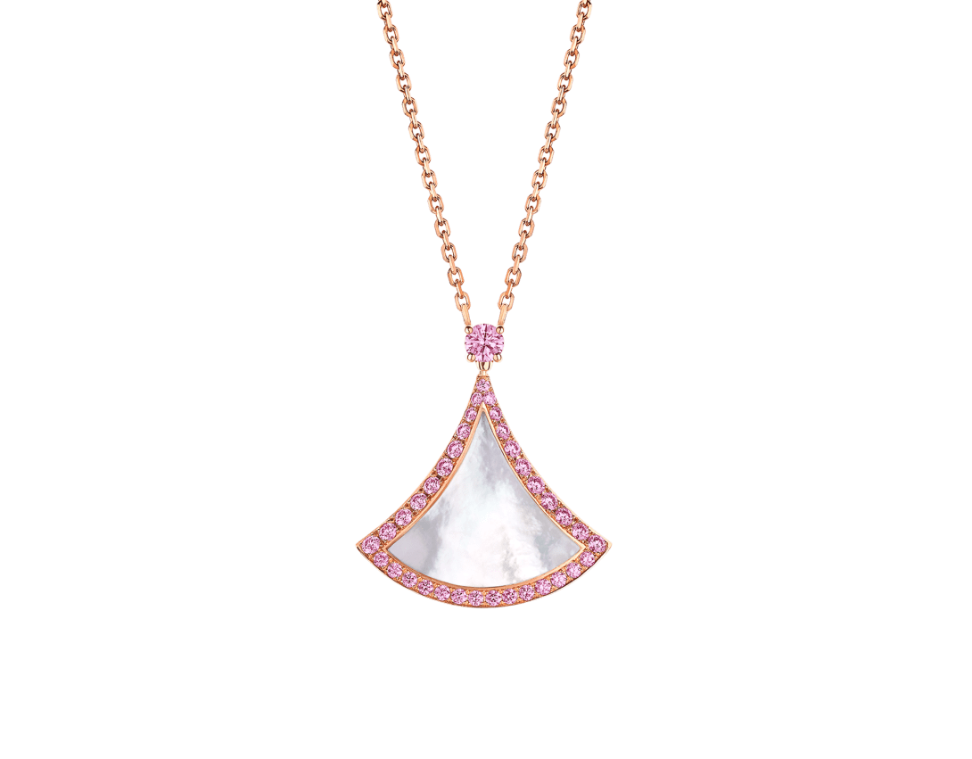 A Special Edition dedicated to Chinese Valentine's Day celebrations, the Divas' Dream 18 kt rose gold necklace pays homage to the most fascinating divas with Roman spirit. Inspired by feminine elegance, its fan-shaped pendant is rendered through a mother-of-pearl insert framed by pink sapphires, which infuse a romatic touch to the piece. An unmistakable signature conjuring the sensual pattern of Rome’s Caracalla mosaics in a tribute to timeless beauty.