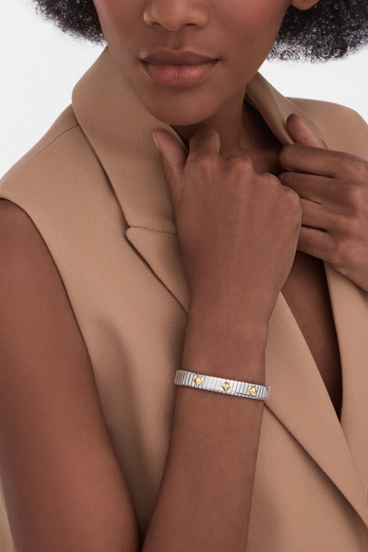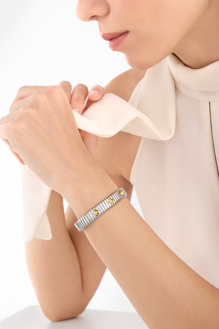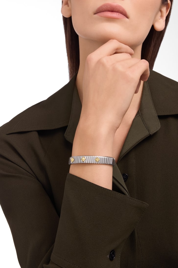 Elevating the jewelry technique cherished by the Roman Maison since the 1940s into an iconic collection, Bvlgari Tubogas stands as a testament to the Maison's relentless drive for experimentation and its ability to mold precious metal like living matter. The Bvlgari Tubogas Gold & Steel bracelet unites steel with noble gold in a bold combination that draws from the Maison's avant-garde aesthetic language and legacy of material exploration. A statement of creative freedom shaped through innovative craftsmanship. Bvlgari Tubogas bracelet in stainless steel with 18 kt yellow gold studs.