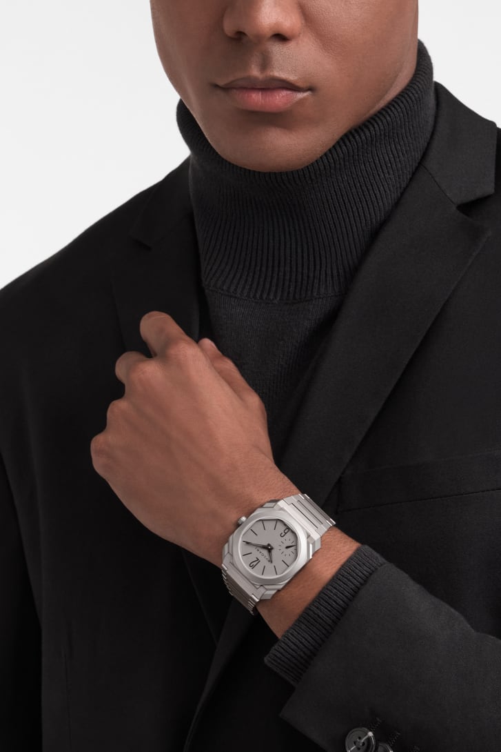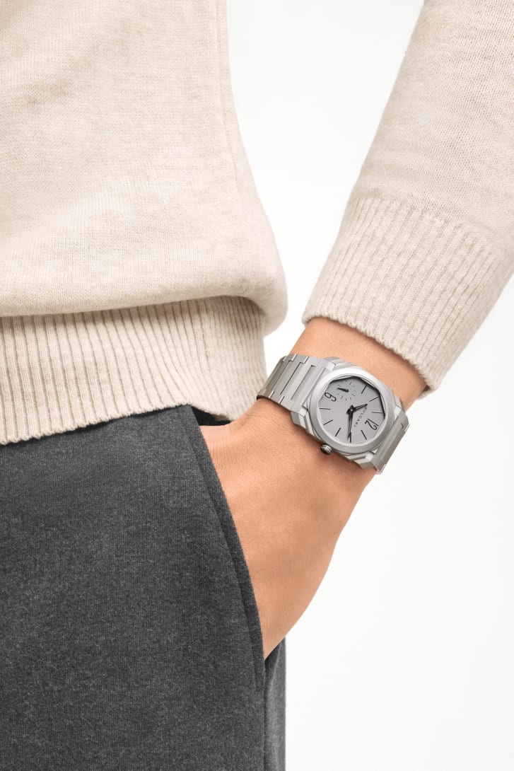 El reloj Octo Finissimo Automatic, un auténtico icono del siglo XXI, refleja la excepcional fusión del diseño atrevido italiano y la ingeniería suiza. Con un refinado diámetro de 37 mm y un movimiento automático ultrafino muy pequeño con reserva de marcha de 72 horas, este reloj en titanio arenado desprende elegancia contemporánea al tiempo que muestra una mecánica vanguardista. Como testimonio del vínculo integral de Bvlgari entre el savoir-faire joyero y el arte relojero, refleja el enfoque distintivo de la Maison para trabajar con materiales poco convencionales y modernos, así como su capacidad para marcar nuevas tendencias de diseño en el mundo de los relojes suizos.