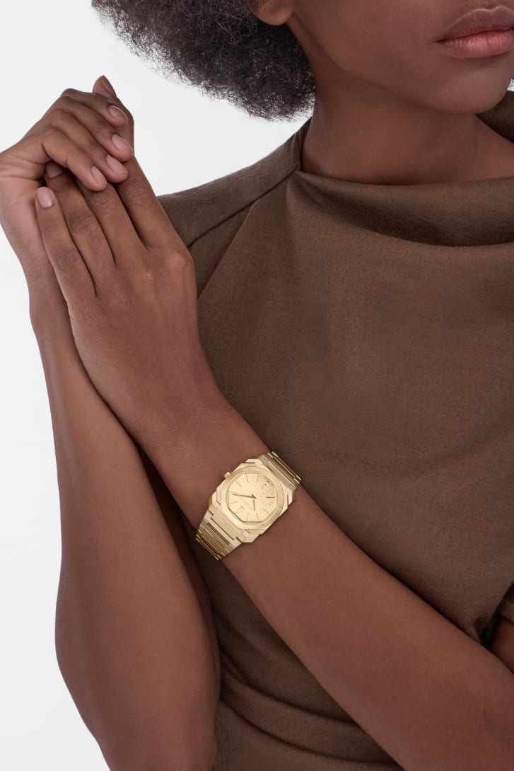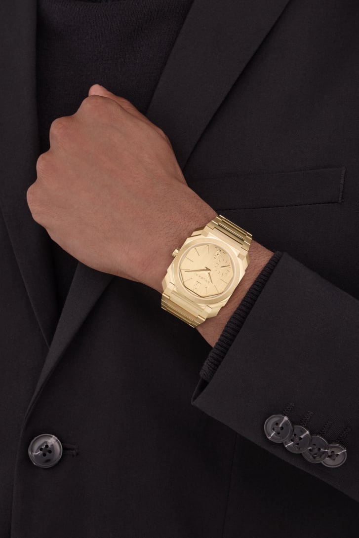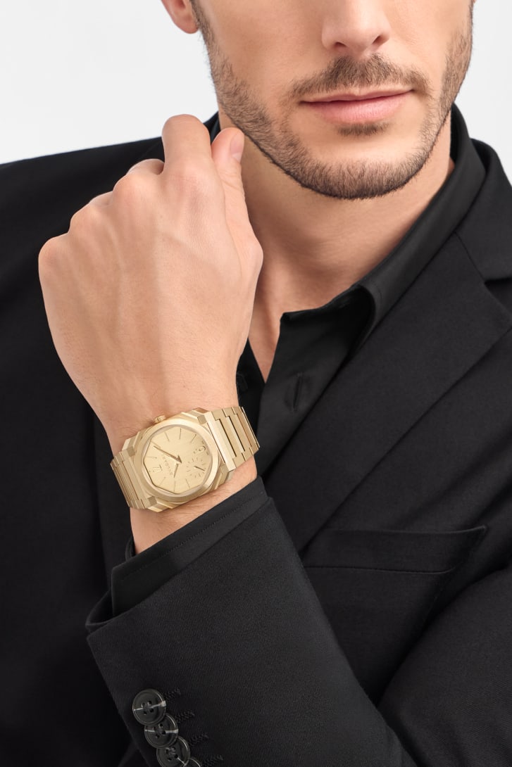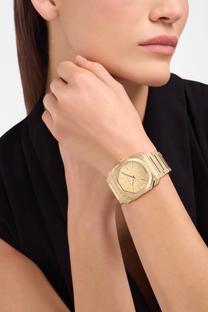 El reloj Octo Finissimo Automatic, un auténtico icono del siglo XXI, refleja la excepcional fusión del diseño atrevido italiano y la ingeniería suiza. Con un refinado diámetro de 37 mm y un movimiento automático ultrafino muy pequeño con una reserva de marcha de 72 horas, el reloj en oro amarillo de 18 qt satinado y pulido desprende elegancia contemporánea al tiempo que muestra una mecánica vanguardista. Como testimonio del vínculo integral de Bvlgari entre el savoir-faire joyero y el arte relojero, refleja el enfoque distintivo de la Maison para trabajar con materiales preciosos, así como su capacidad para marcar nuevas tendencias de diseño en el mundo de los relojes suizos.