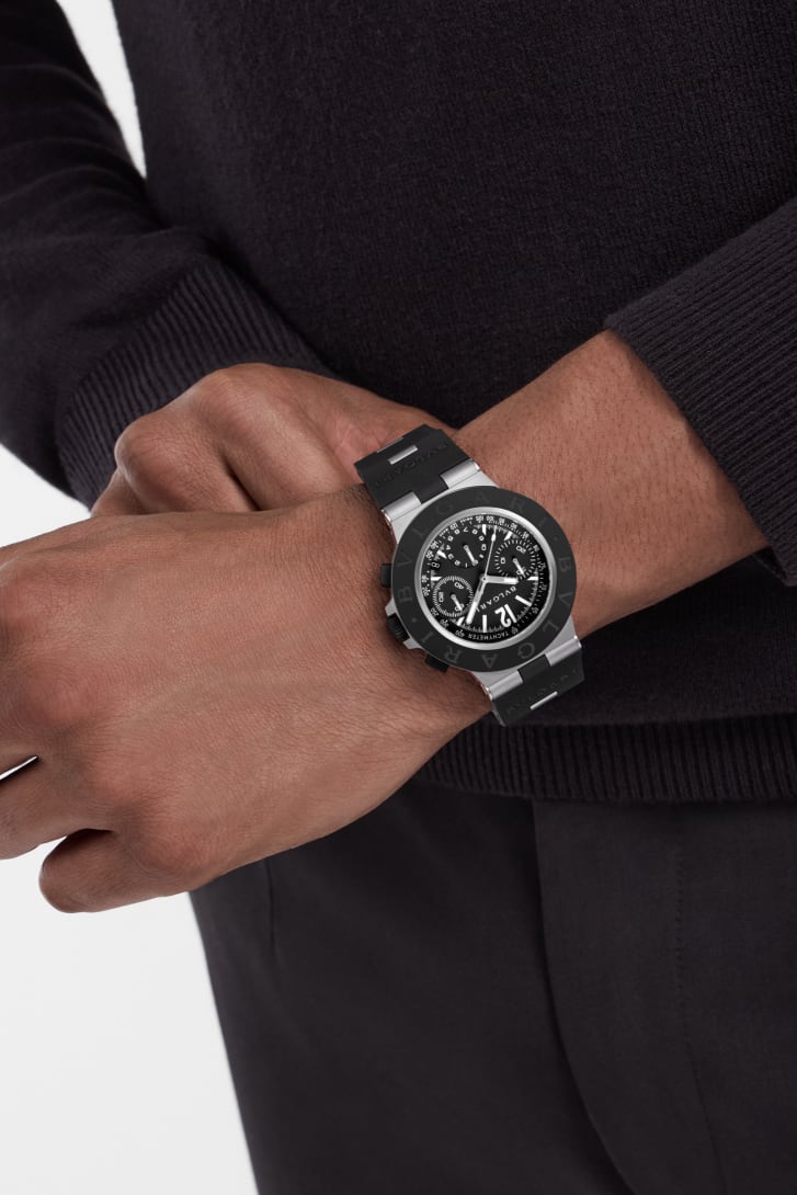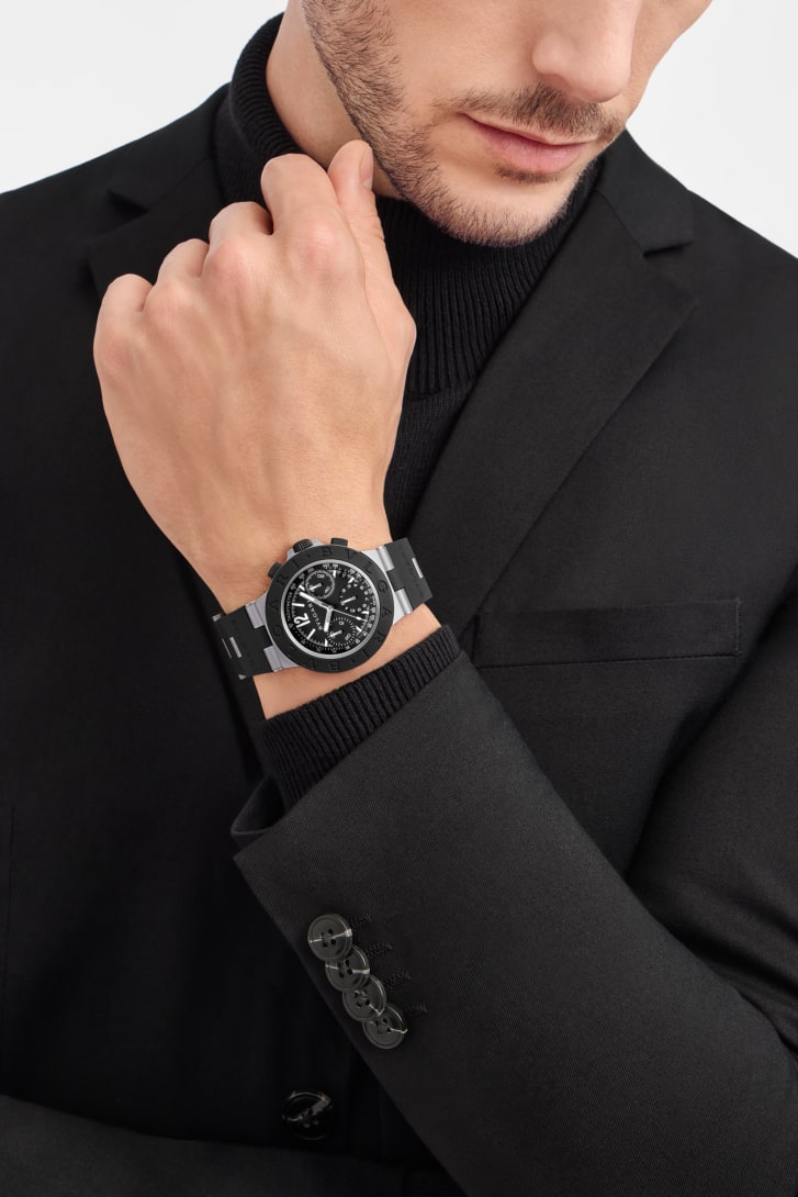 Reloj Titanio Chronograph con movimiento mecánico de manufactura, carga automática, cronógrafo, funciones de horas, minutos, segundos y fecha, reserva de marcha de 42 horas, caja de 41 mm en titanio arenado, bisel en caucho negro con grabado Bvlgari Bvlgari, corona en titanio con revestimiento DLC, esfera y contadores negros, índices, agujas de horas y minutos rellenas con SLN, segundero de cronógrafo gris, agujas de subesferas grises, fondo de caja en titanio con revestimiento DLC, correa en caucho negro con eslabones en titanio y cierre con sistema de mosquetón y anilla. Hermético hasta 100 metros.