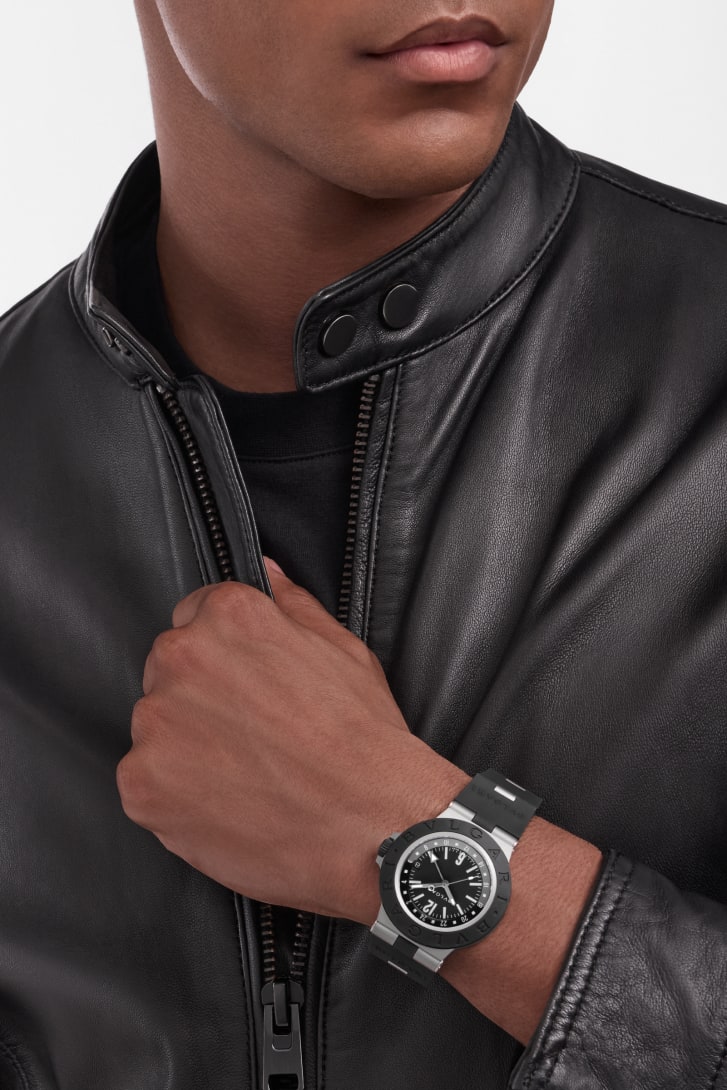 Reloj Bvlgari Titanio GMT con movimiento mecánico de manufactura, carga automática, función GMT 24 horas, caja de 40 mm en titanio arenado, bisel en caucho negro con grabado Bvlgari Bvlgari, esfera negra y correa en caucho negro. Hermético hasta 100 metros