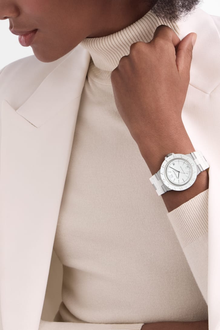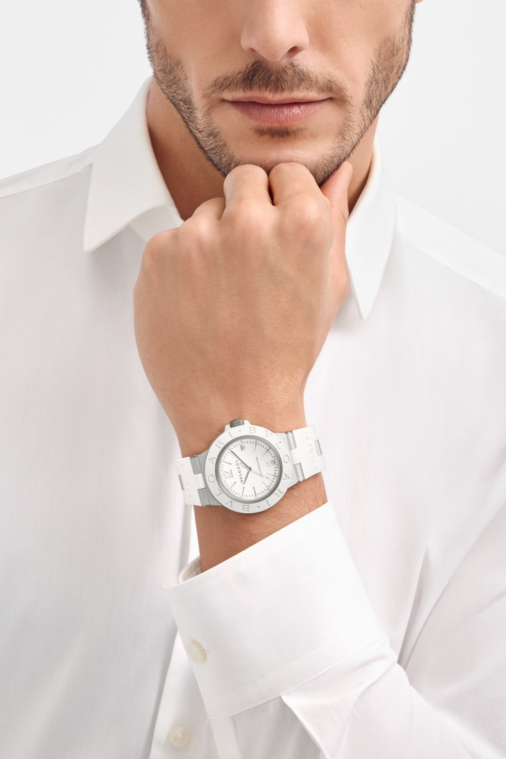Reloj Bvlgari Aluminium White Automatic con movimiento mecánico de manufactura, carga automática, horas, minutos, segundero central y fecha, calibre B77 (3,60 mm de grosor), reserva de marcha de 42 horas, 28 800 VpH (4 Hz). Caja de 40 mm en aluminio arenado, bisel en caucho blanco con grabado BVLGARI BVLGARI, esfera lacada en blanco opalescente con índices con acabado rodiado, agujas de las horas y los minutos en latón con acabado rodiado pulido y rellenas con Super-LumiNova®, aguja del segundero central en latón con acabado rodiado pulido con extremo lacado en blanco, ventana de fecha a las 3 horas, corona en titanio arenado, fondo de caja en titanio con acabado arenado y satinado, correa en caucho blanca con eslabones y hebilla en aluminio arenado. Hermético hasta 100 metros.