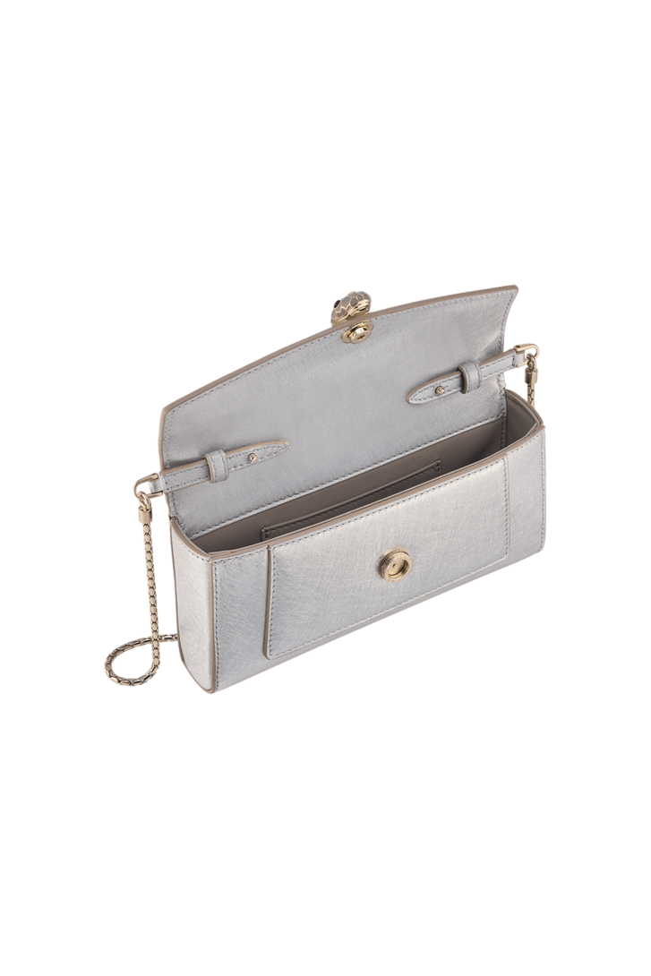 Funda para teléfono Serpenti Forever en piel de becerro Striated plateada con forro en piel de napa gris. Cautivador cierre magnético con la icónica cabeza de serpiente en latón bañado en dorado claro realzado con esmalte gris, escamas en latón bañado en dorado claro y ojos en ónix negro.
