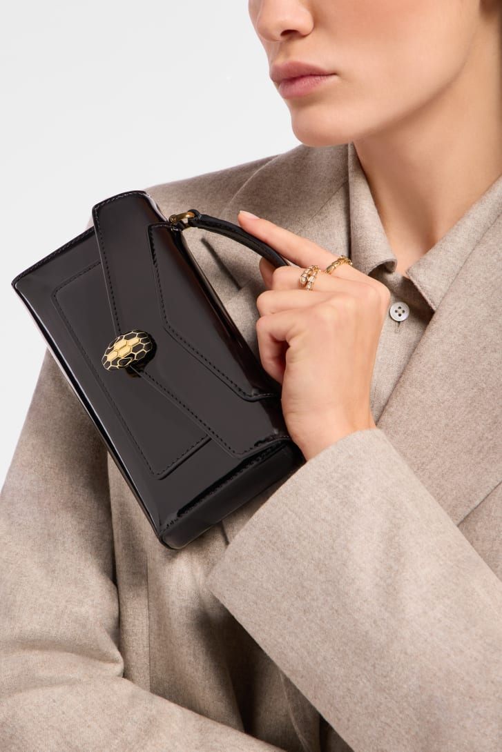 Funda para teléfono Serpenti Forever en piel de becerro cepillada y brillante negra. Cautivador cierre magnético de cabeza de serpiente en latón bañado en oro sublimado con escamas en esmalte negro y bañadas en oro y ojos en ónix negro.