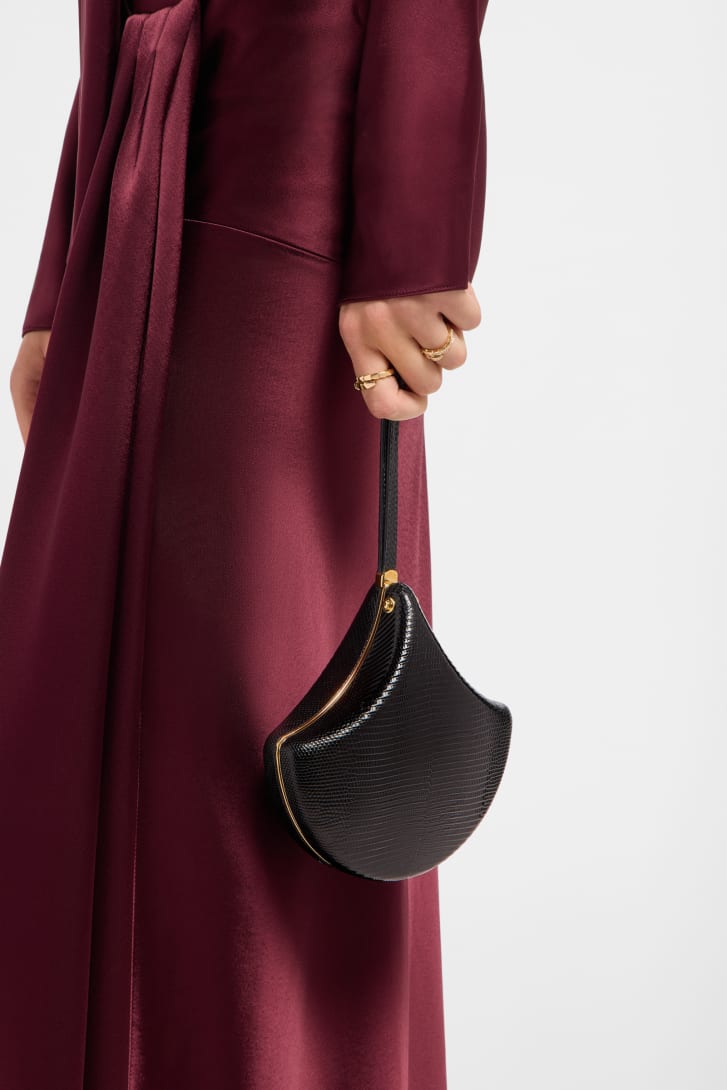 El bolso Ginkgo, confeccionado en exquisita piel de lagarto negra, es una celebración del refinado motivo Calla, inspirado en los mosaicos de las termas de Caracalla, en su forma más pura. El bolso de noche, una mezcla única de inspiración romana y diseño icónico, exquisita artesanía en marroquinería y savoir-faire joyero, está elegantemente suspendido de una correa en piel para la muñeca y cuenta con un único compartimento. 16 x 16,5 x 5 cm. Fabricado en Italia.