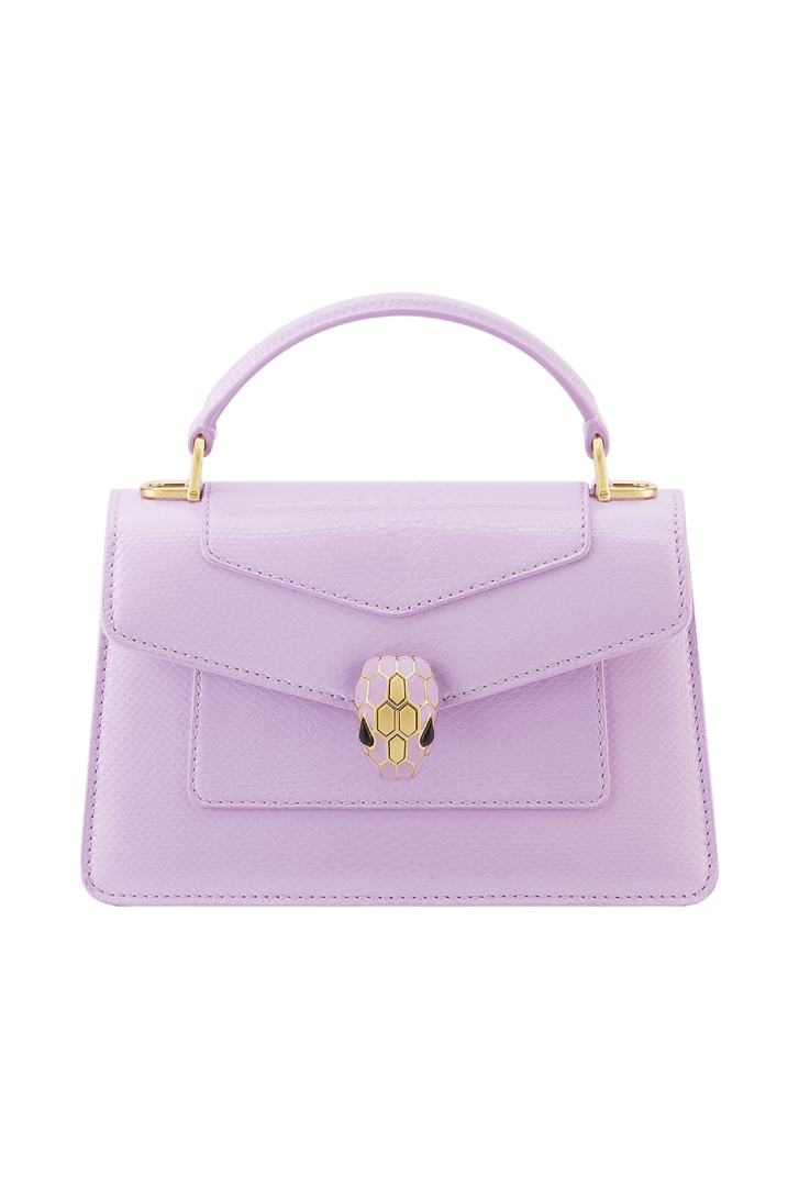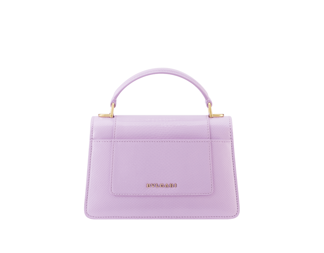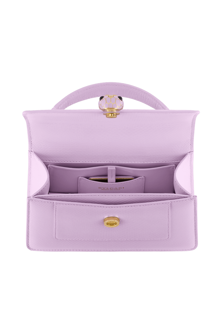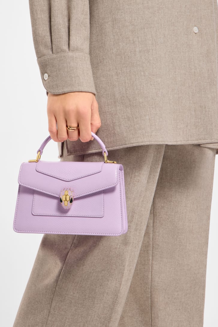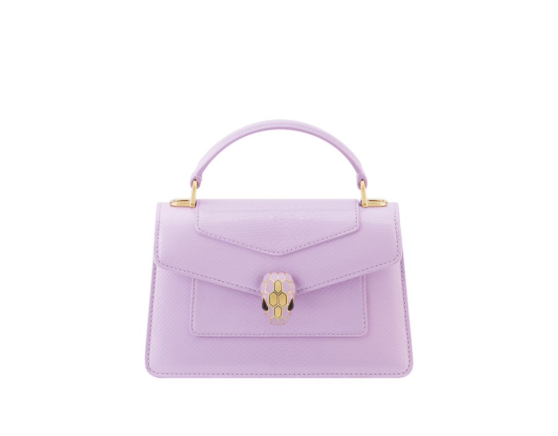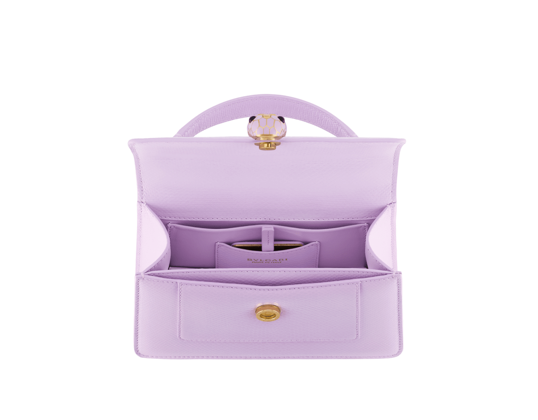 Minibolso Serpenti Forever en piel de karung Pure amatista clara con forro en piel de napa amatista clara. Cautivador cierre magnético de cabeza de serpiente en latón bañado en oro realzado con escamas en esmalte amatista clara y latón bañado en oro claro, y ojos en ónix negro.