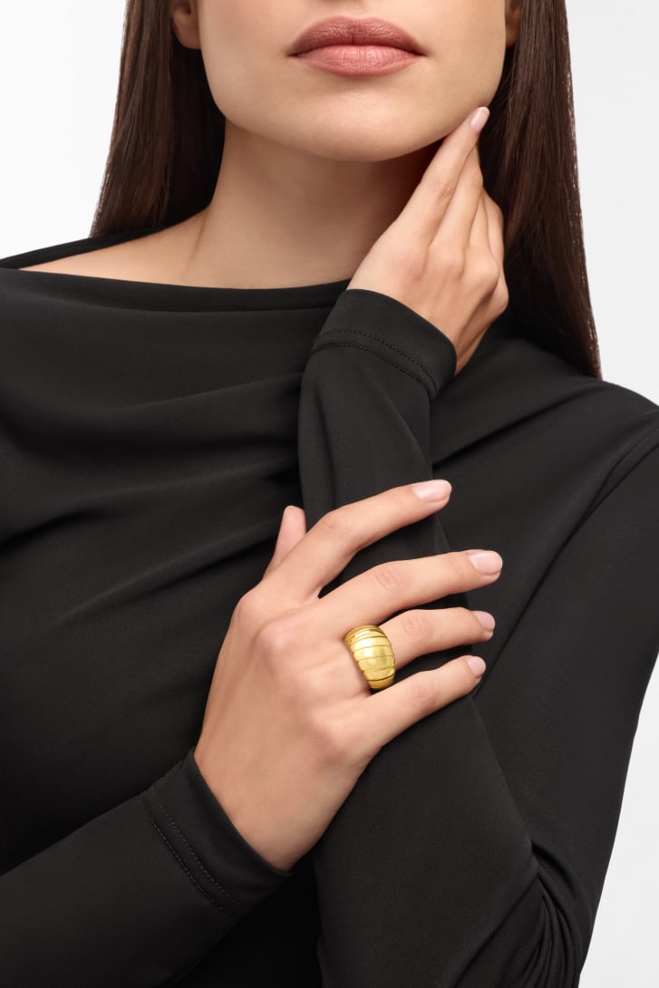 Bvlgari Tubogas, la técnica joyera venerada por la Maison romana desde los años 40 en una colección icónica, es un testimonio del impulso de Bvlgari por la experimentación y capacidad para moldear los metales preciosos como una materia llena de vida. El anillo Bvlgari Tubogas en oro amarillo liso de 18 qt, fruto de la mezcla única de diseño industrial vanguardista y maestría artesanal superior, encarna el estilo eternamente contemporáneo de la línea en su estética más pura y distintiva.