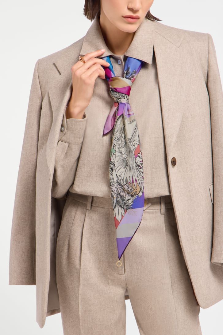 Confectionné en sergé de soie multicolore et complété par un pendentif en métal BVLGARI BVLGARI en métal, le foulard Polychroma est une ode audacieuse et multiforme à la richesse infinie de la couleur. Recréant l'éclat d'une pierre précieuse taillée, son design encadre le Miroir de Vénus, symbole antique du reflet de la beauté, tout en évoquant l'héritage mythologique et l'identité intemporelle de Bvlgari. Témoignant du savoir-faire inégalé de la Maison, il est réalisé grâce à une technique de double impression qui met en valeur plus de trente teintes sur les deux faces. Offrant des possibilités de style infinies, l’accessoire peut être noué autour du cou pour un look iconique ou porté de manière tendance dans les cheveux. 90 x 90 cm. 100 % soie. Fait main en Italie.