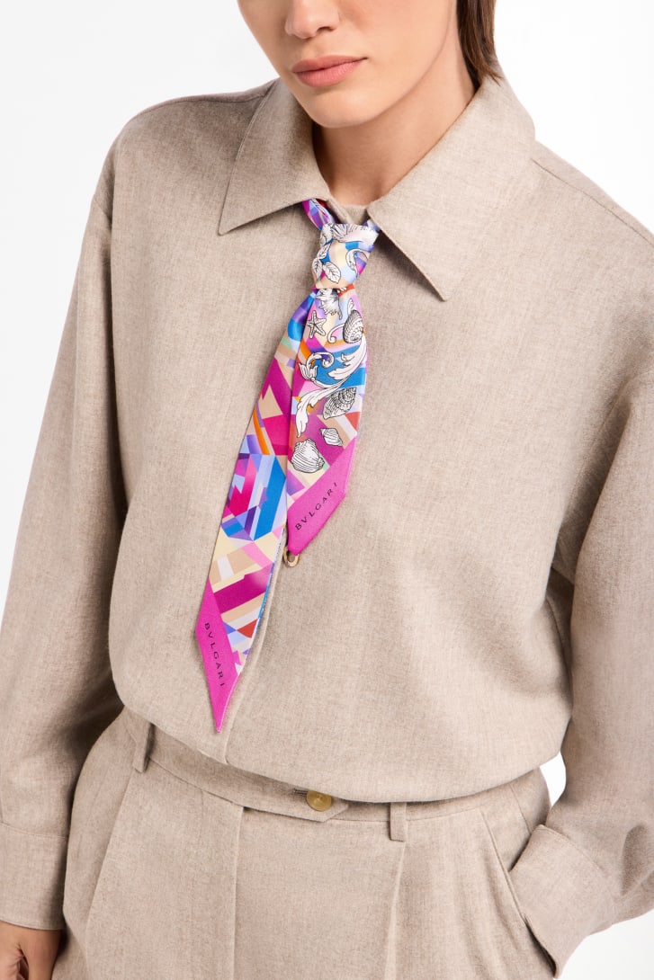 Confectionnée en sergé de soie multicolore et complétée par un pendentif en métal BVLGARI BVLGARI, l'étole Polychroma est une ode audacieuse et multiforme à la richesse infinie de la couleur. Recréant l'éclat d'une pierre précieuse taillée et enrichi de motifs inspirés des courbes de Vénus, son design évoque l'héritage mythologique et l'identité intemporelle de Bvlgari. Un petit bijou exquis, idéal à offrir, cet accessoire ultra-polyvalent se porte élégamment autour du poignet ou du cou, se noue à la taille comme une ceinture ou s'enroule autour des anses d'un sac ou d'un chapeau. 5 x 120 cm. 100 % sergé de soie. Fait main en Italie.