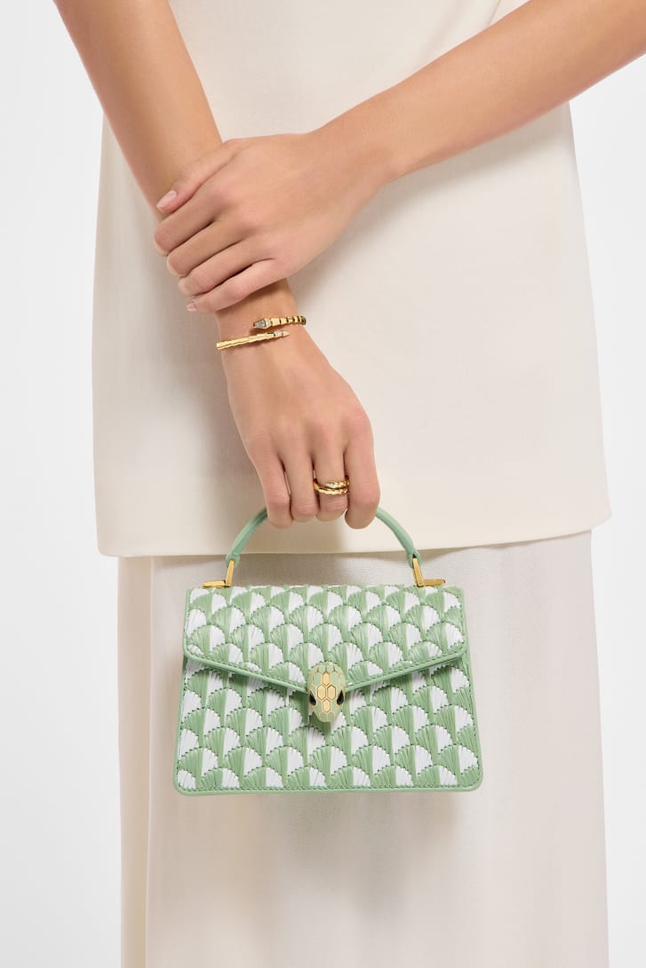 Sac à main Serpenti Forever mini modèle avec motif Calla en raphia couleur péridot clair et blanc et doublure en cuir nappa couleur péridot clair. Captivant fermoir magnétique Serpenti en laiton doré rehaussé d’écailles en émail couleur péridot clair et laiton doré et d’yeux en onyx noir.