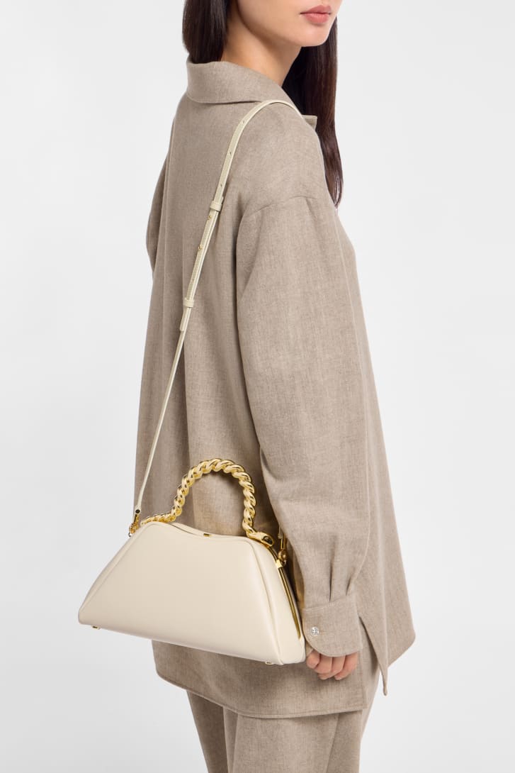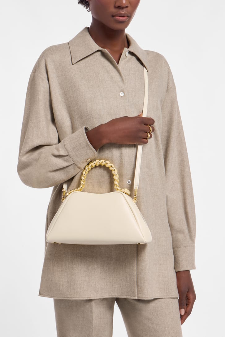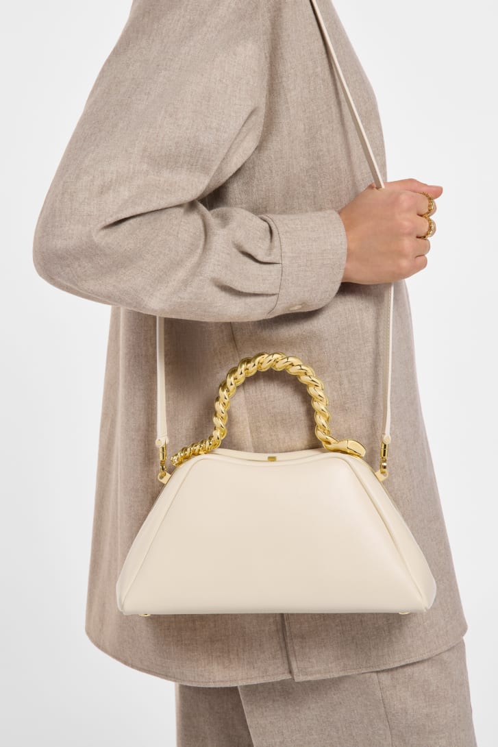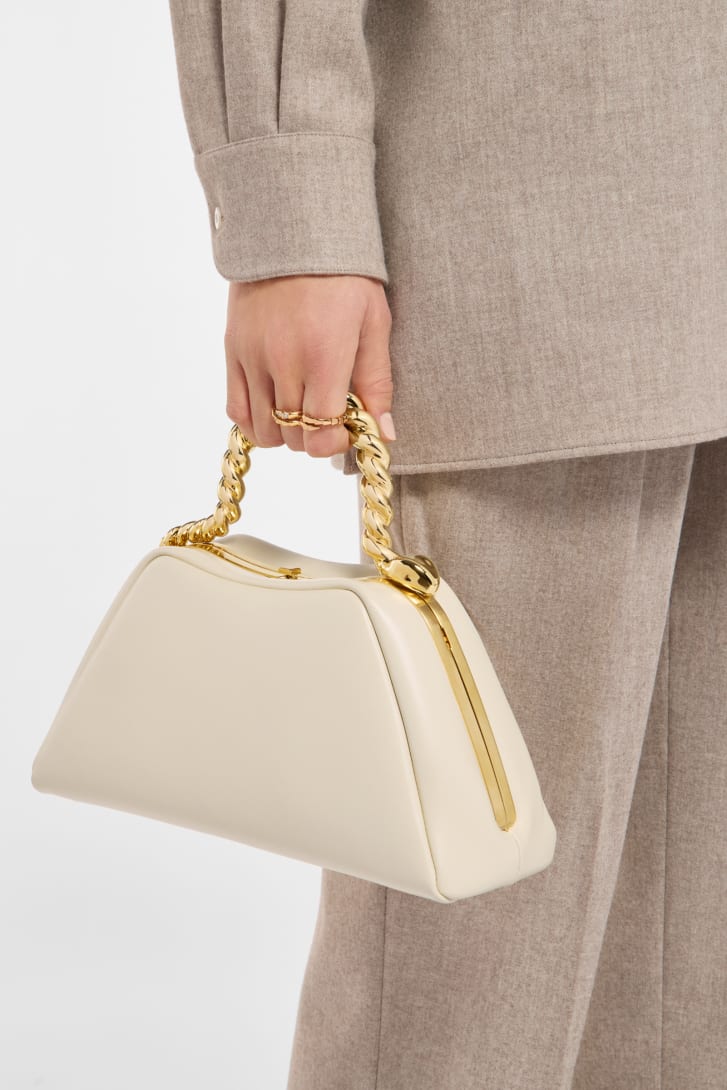 Sac à main Géraldine Guyot x Bvlgari Serpentine petit modèle en cuir de veau couleur opale ivoire avec doublure en cuir nappa couleur opale ivoire. Poignée supérieure en forme de serpent réimaginée en laiton plaqué or et fermeture à bouton-pression.