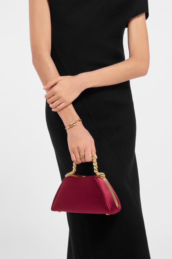 Sac à main Géraldine Guyot x Bvlgari Serpentine mini modèle en satin bordeaux foncé avec doublure en cuir nappa bordeaux foncé. Poignée supérieure en forme de serpent réimaginée en laiton plaqué or et fermeture à bouton-pression.
