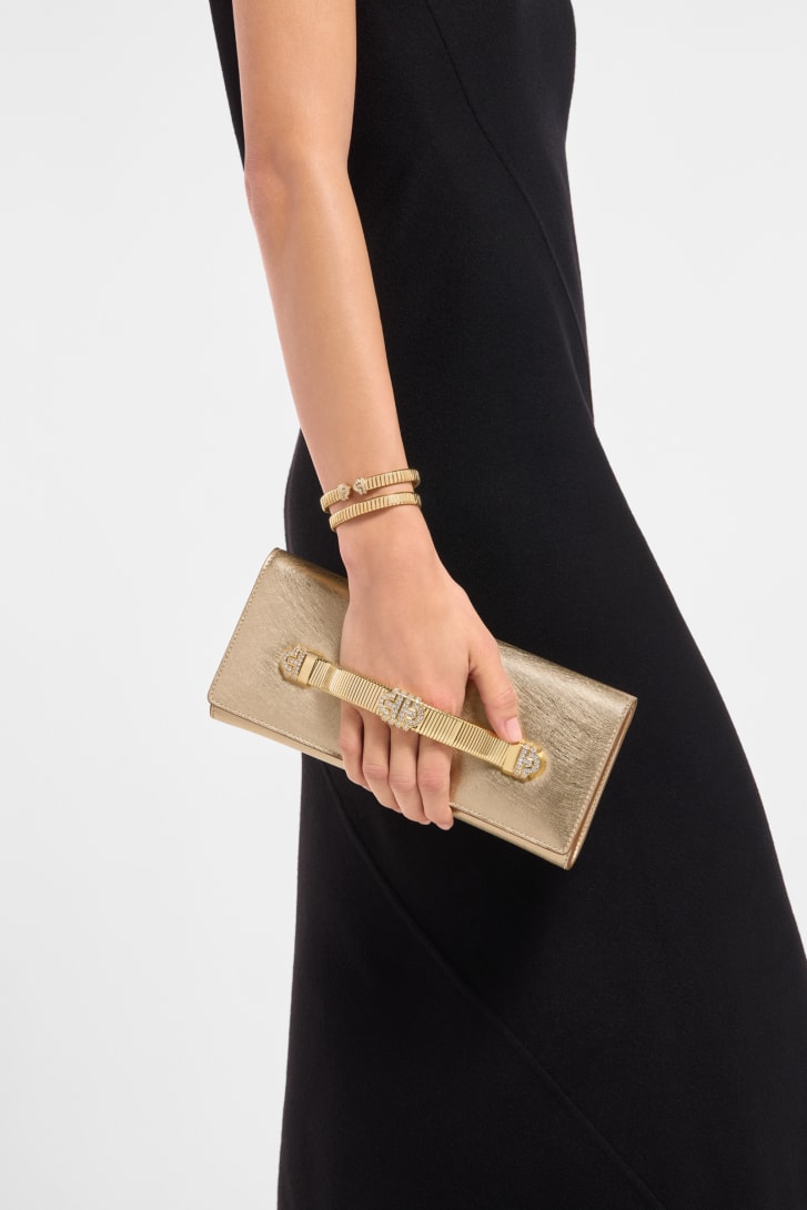 Mélange élégant des univers joailliers et maroquiniers de Bvlgari, cette captivante pochette de soirée Bvlgari Tubogas est confectionnée en cuir de veau strié doré et arbore un effet métallisé et strié qui rappelle les magnifiques inclusions des diamants bruts. Sa poignée d’inspiration joaillière reproduit les spirales sinueuses de Tubogas - une signature de la Maison depuis les années 1940 - et s'enrichit du motif géométrique Parentesi, profondément ancré dans l'héritage culturel de Rome. Le modèle est complété par un compartiment unique, une fente intérieure pour cartes et le logo Bvlgari en métal au dos. Dimensions : 25 x 12,5 x 3,5 cm. Modèle fabriqué en Italie.