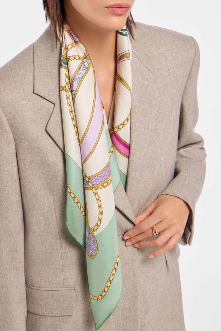 Foulard Serpenti 75 en sergé de soie imprimé et jacquard fin couleur péridot clair doté d’un pendentif en métal BVLGARI BVLGARI. Modèle confectionné à 100 % de soie.