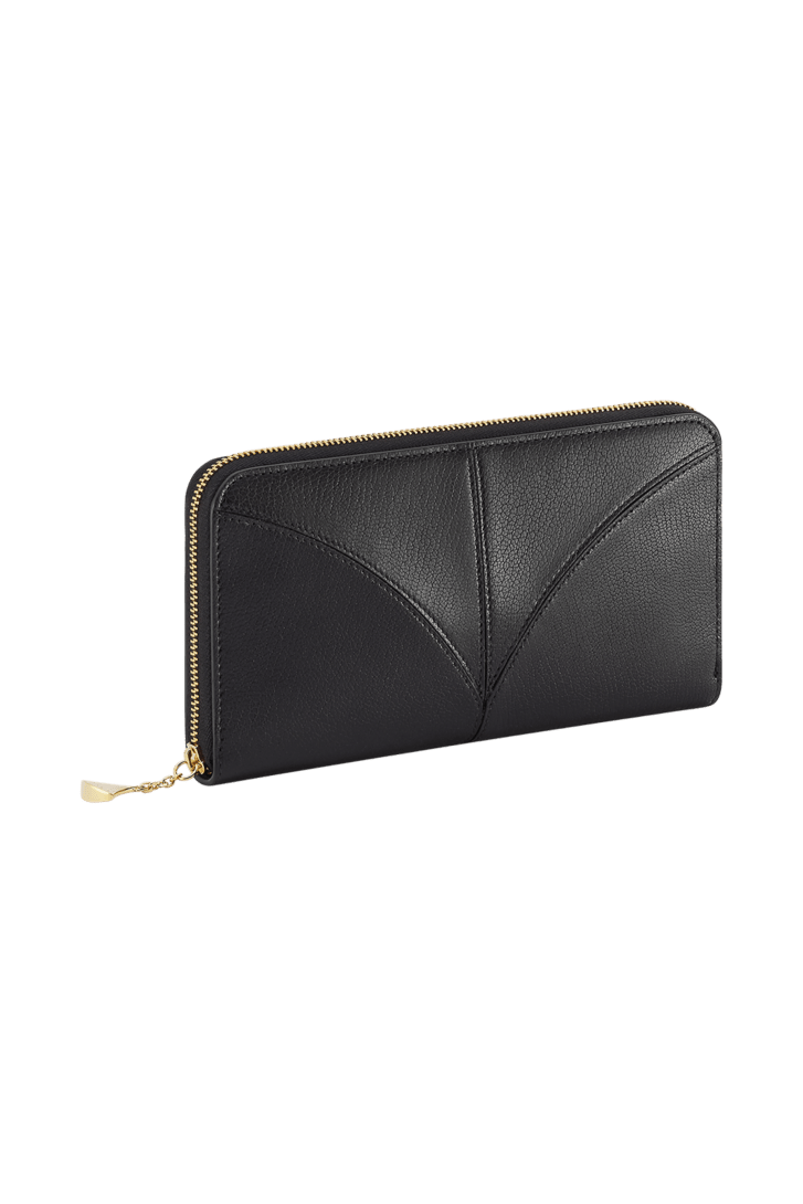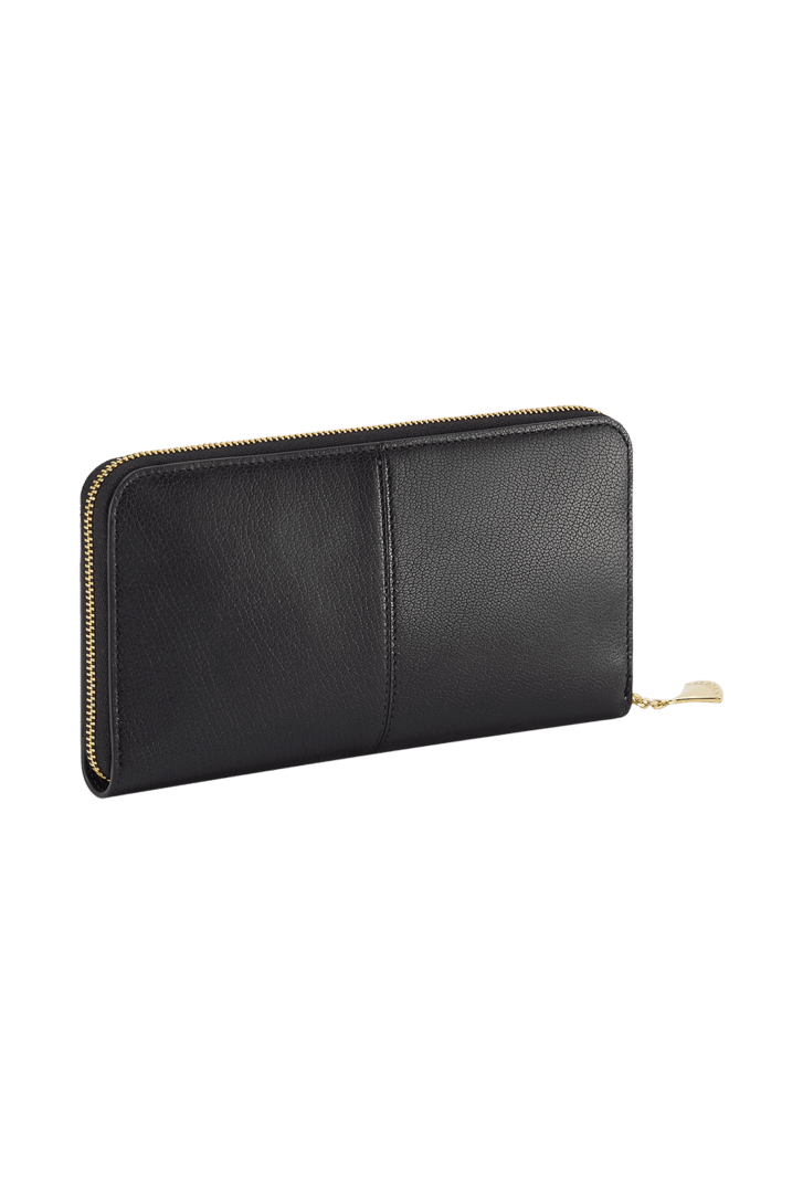 Grand portefeuille Divas’ Dream en cuir de chèvre noir avec intérieur en cuir nappa noir. Pendentif signature raffiné en laiton doré et fermeture zippée.
